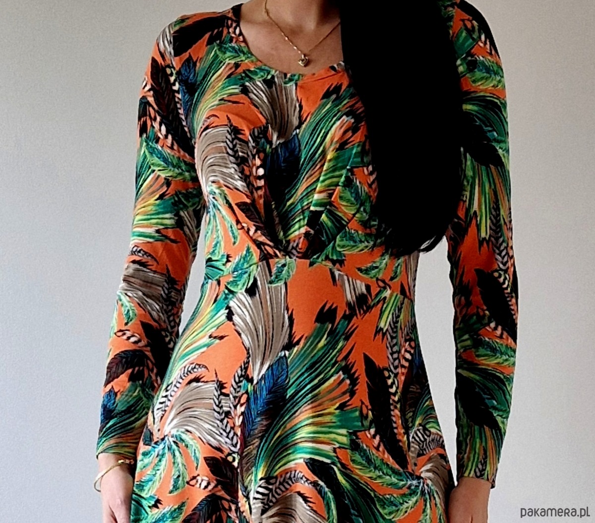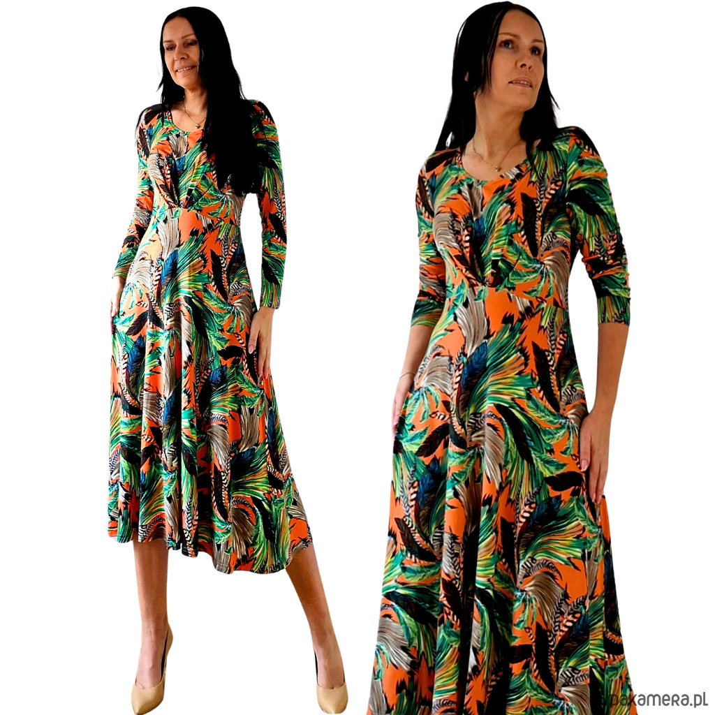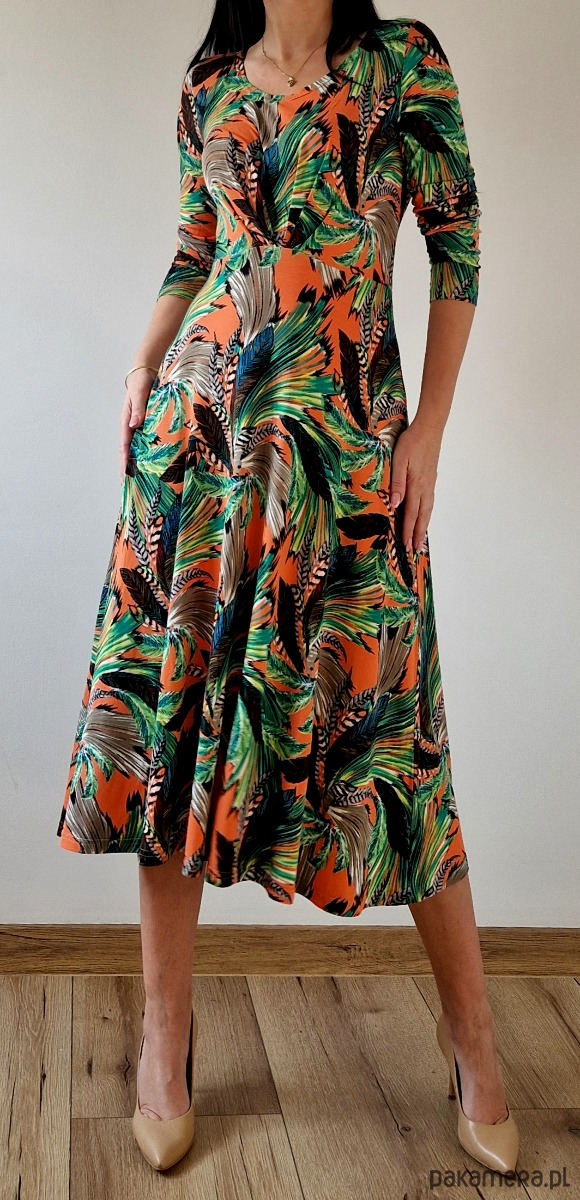 Codzienna sukienka w kolorowe pióra na pomarańczowym tle – idealna na sezon wiosna lato 2025