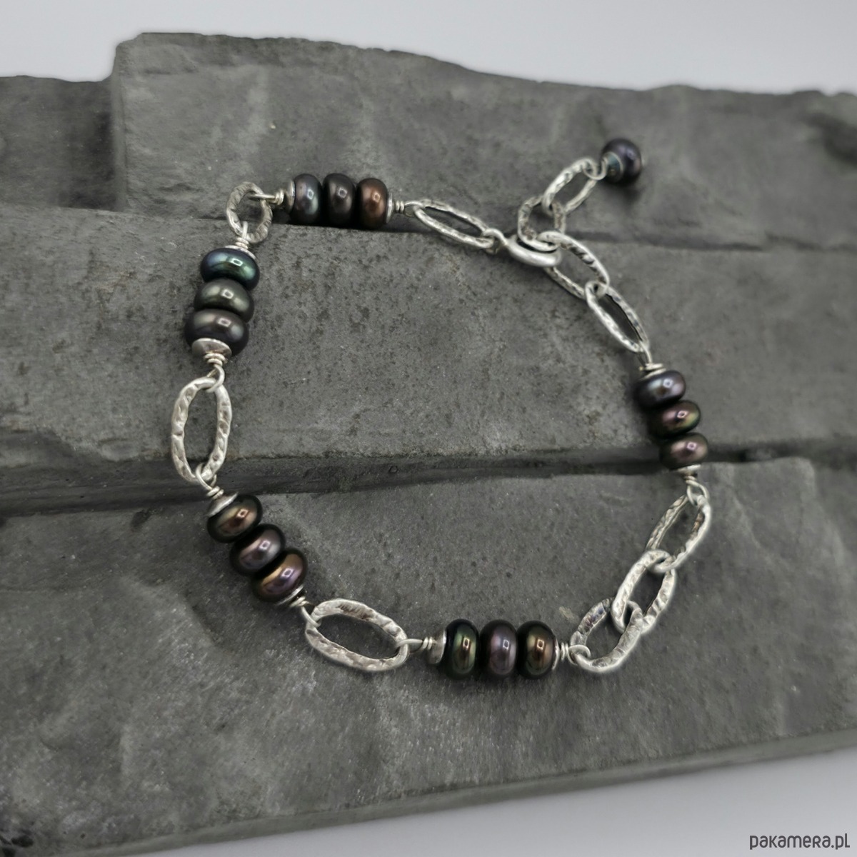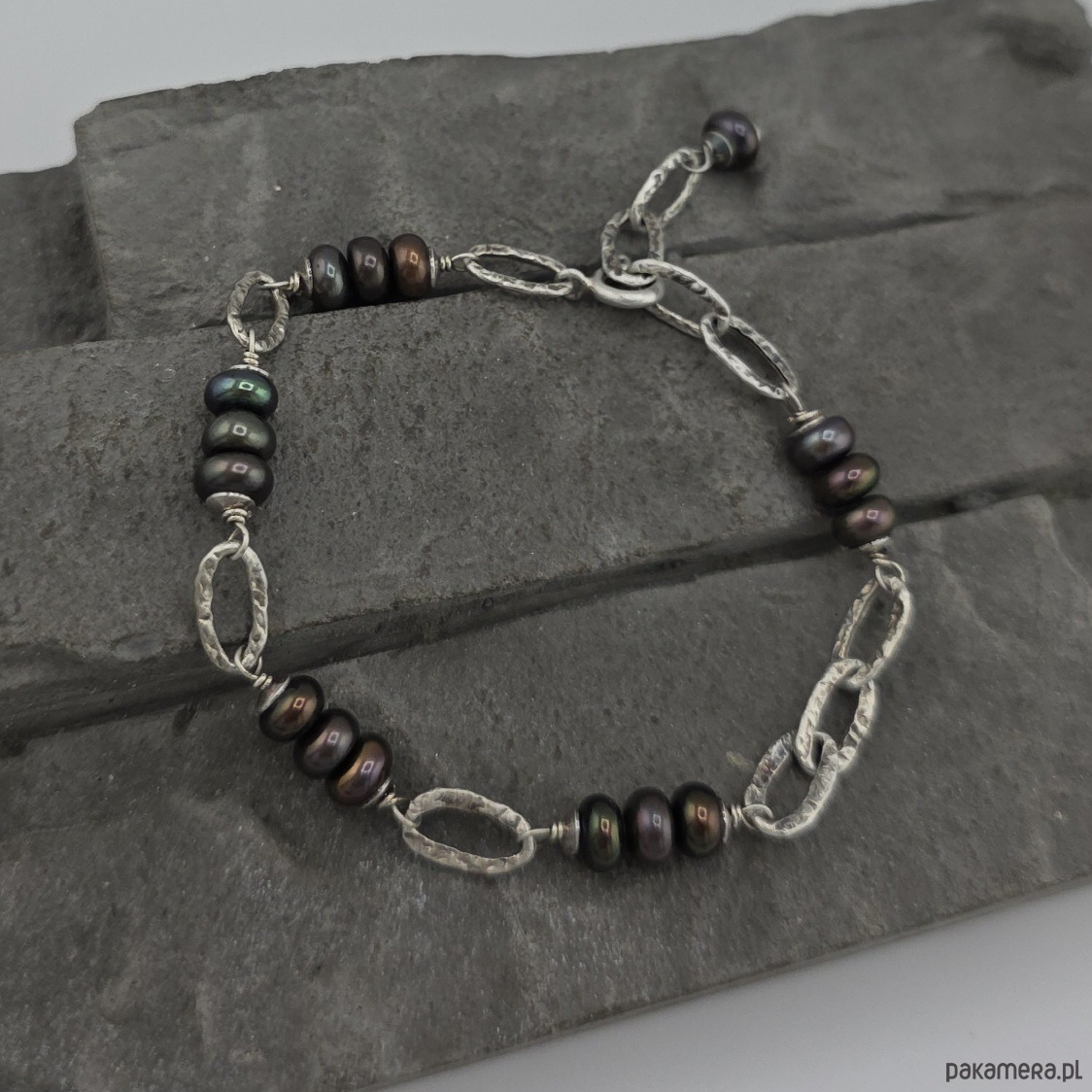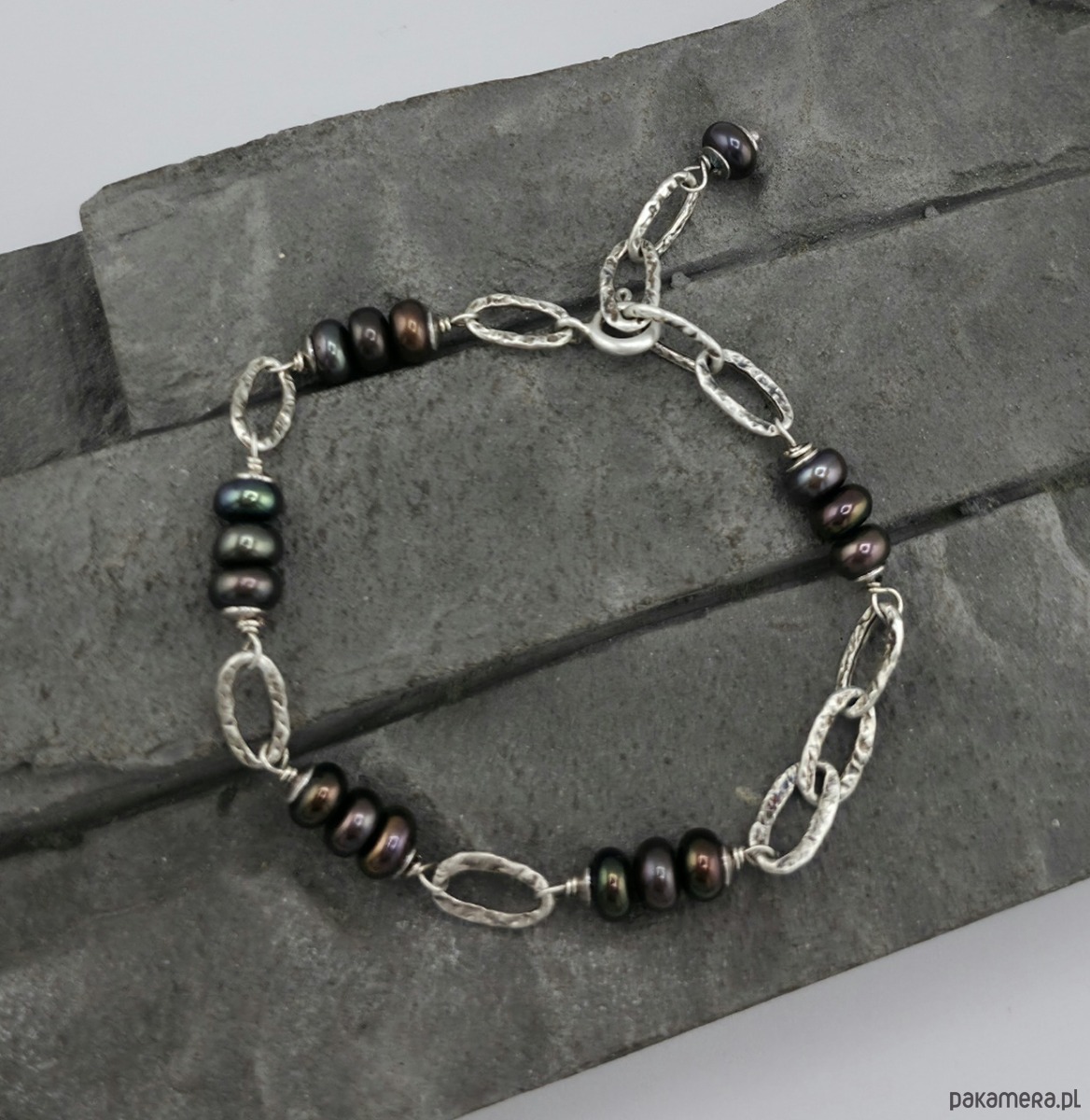Kobieca i minimalistyczna bransoletka na co dzień i nie tylko. Wykonana w całości z oksydowanego srebra próby 925 oraz naturalnych pereł słodkowodnych wielkości ok. 6x4 mm. Całkowita długość bransoletki regulowana od 17,5 cm do 20 cm. W mojej galerii są dostępne kolczyki do kompletu. Ozdobnie zapakowana.