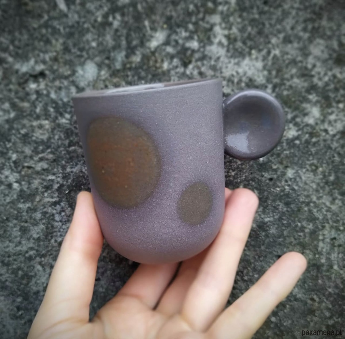 Ceramiczny kubek, wykonany z mocno spieczonej kamionki, wykonany tradycyjną techniką wypalania z wykorzystaniem szkliw popiołowych pozyskanych z ziaren kawy, kubek wewnątrz szkliwiony błyszczącym szkliwem transparentnym, przeznaczonym do kontaktu z żywnością. Wymiary: wysokość ok.8cm, średnica ok.6,5cm