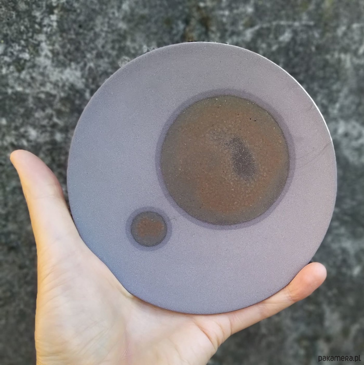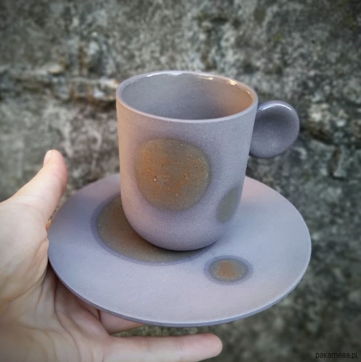 Ceramiczny kubek ze spodkiem, wykonane z mocno spieczonej kamionki, wykonane tradycyjną techniką wypalania z wykorzystaniem szkliw popiołowych pozyskanych z ziaren kawy, kubek wewnątrz szkliwiony błyszczącym szkliwem transparentnym, przeznaczonym do kontaktu z żywnością. Wymiary: Kubek - wysokość ok.8cm, średnica ok.6,5cm, spodek - średnica 13cm