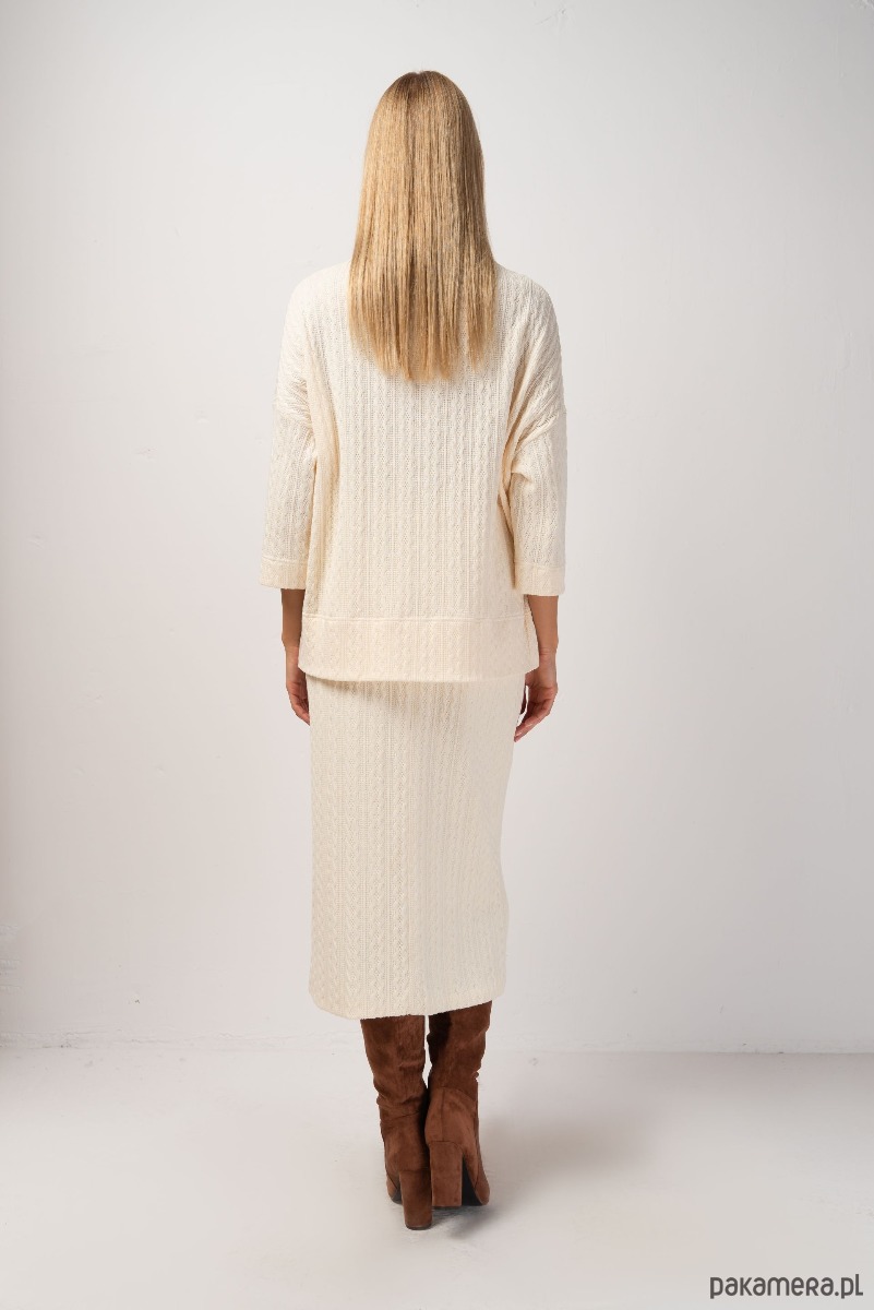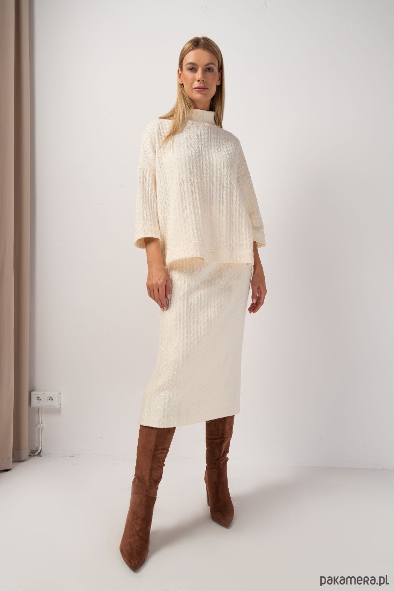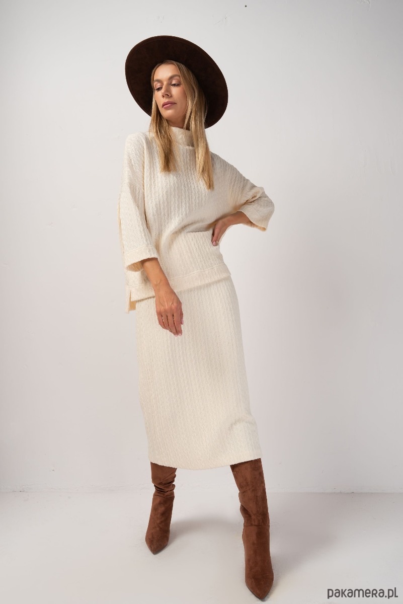 Spódnica ołówkowa o długości MIDI z wysokim stanem, uszyta ze swetrowej dzianiny ze strukturalnym wzorem. Jest elastyczna, dopasowuje się do sylwetki, nie krępując przy tym ruchów. Od wewnątrz podszyta gładką podszewką. W pasie wszyta szeroka, wygodna guma. Wraz z bluzką COLA tworzy spójną, jesienną stylizację.
