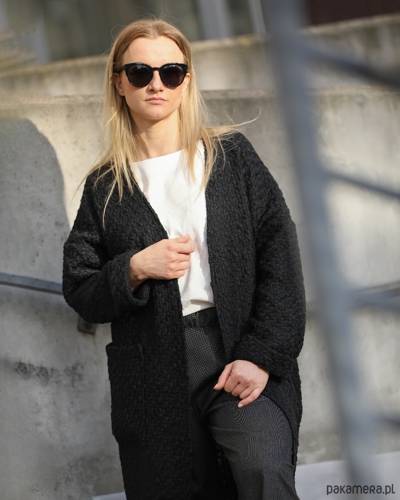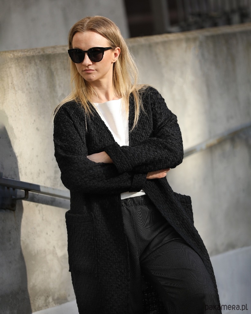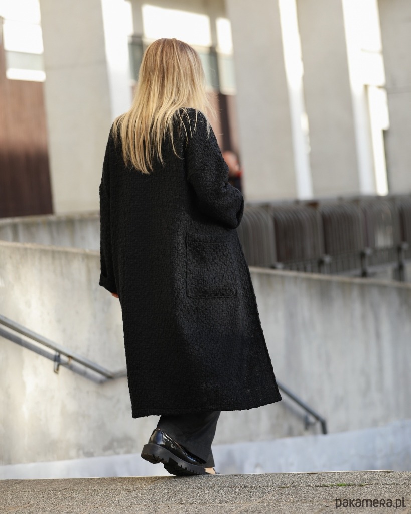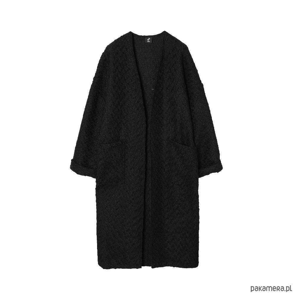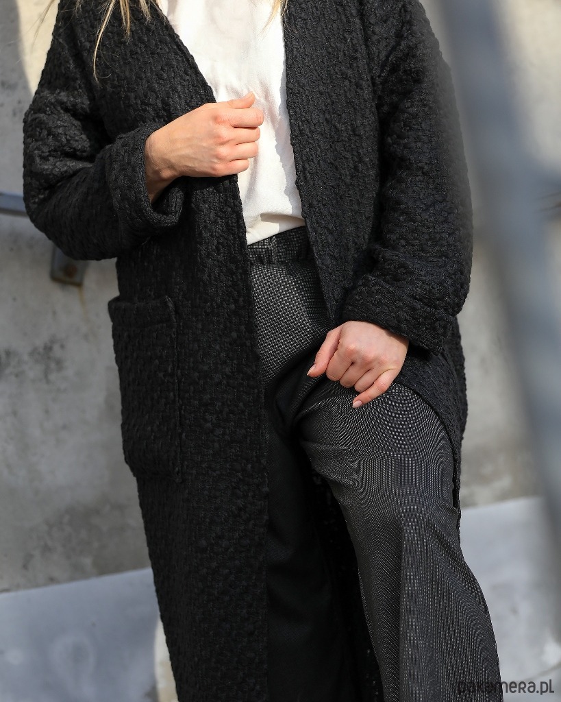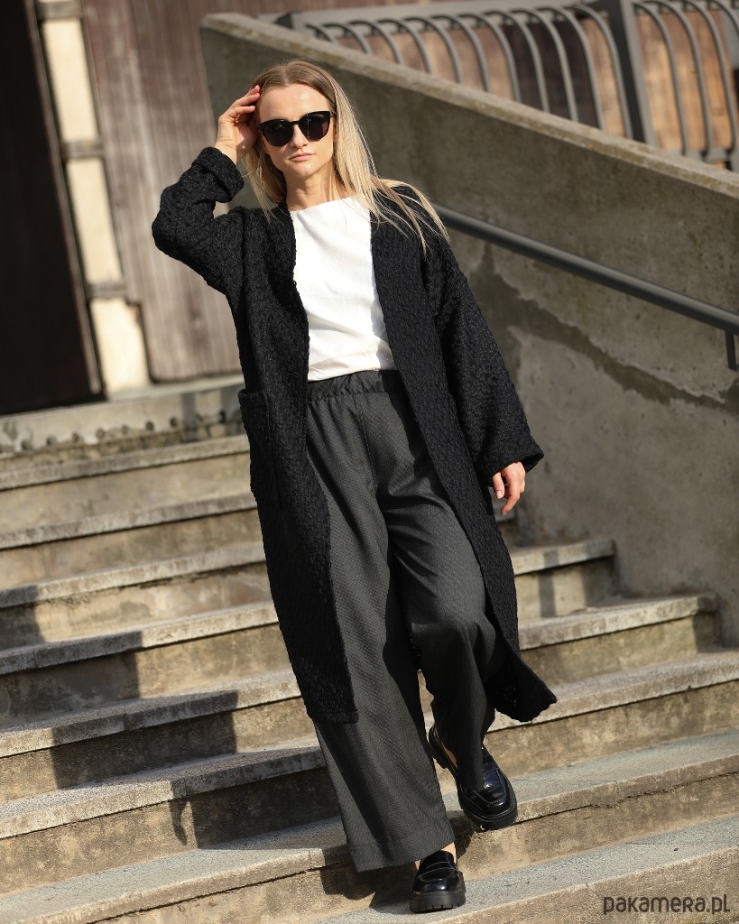 Luźny i bardzo wygodny kardigan sięgający do połowy łydki. Wykonany z wysokogatunkowej tkaniny bawełnianej o grubym, przestrzennym splocie. Po bokach dwie duże naszywane kieszenie. Obszerne rękawy zakończone szerokim mankietem.