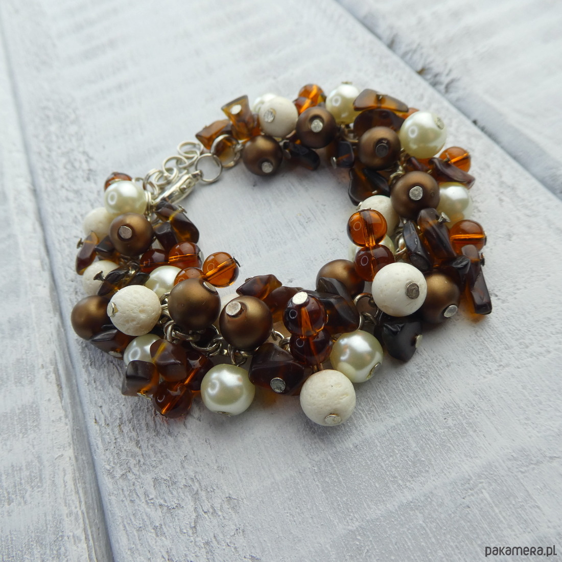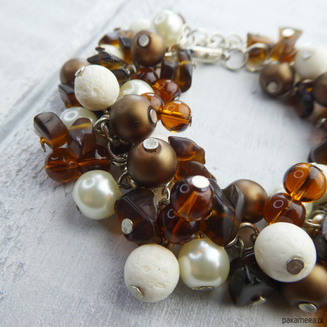 Bransoletka wykonana z kameini naturlanych ( koral biały), pereł szklanych, szkła, elementów srebrzonych. Długość bransoletki regulowana: 17 - 19,5 cm. Odpowiednia na nadgarstek o obwodzie: 14,5- 16 cm.