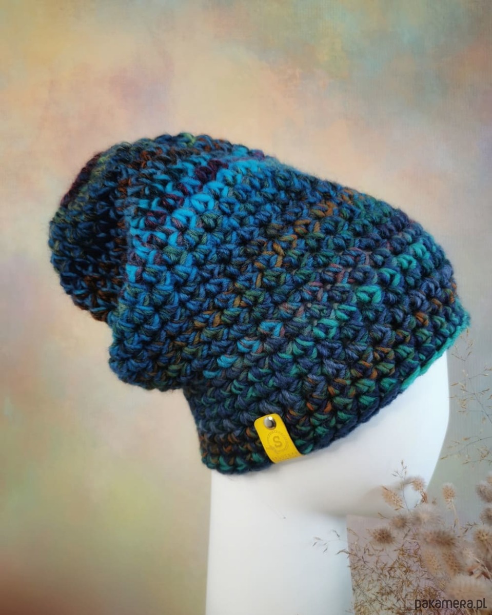 W czapce "leśne szepty" oprócz odcieni zieleni i brązów pojawia się sporo niebieskości,