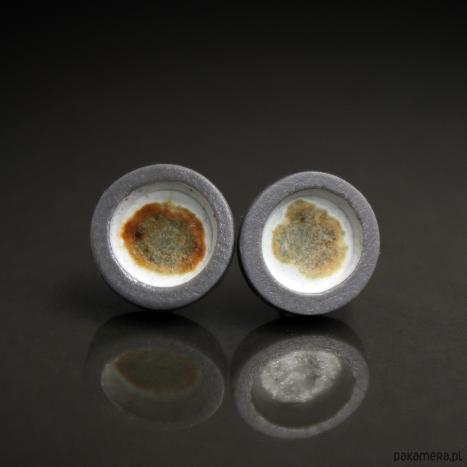 Efektowne nieregularne kolczyki w formie sztyftów, ręcznie wykonane z delikatnej porcelany, pokryte szkliwem popiołowym, pozyskanym z martwych świerszczy, utrwalonym autorską techniką w wysokiej temperaturze, na antyalergicznych sztyftach w kolorze srebrnym. średnica elementu ceramicznego ok. 11mm, grubość około 4mm.