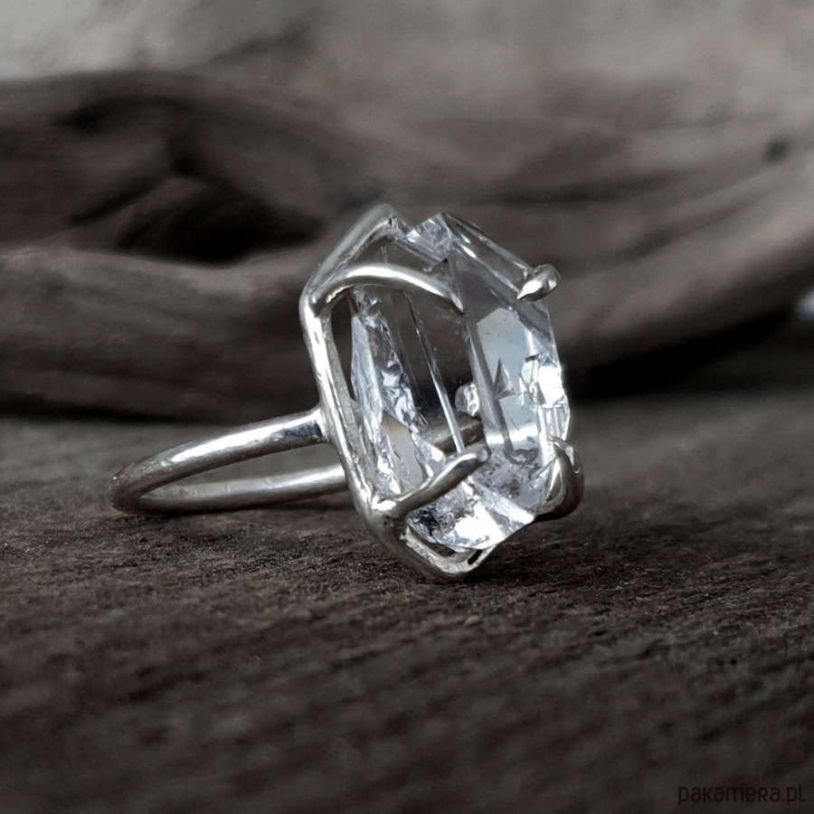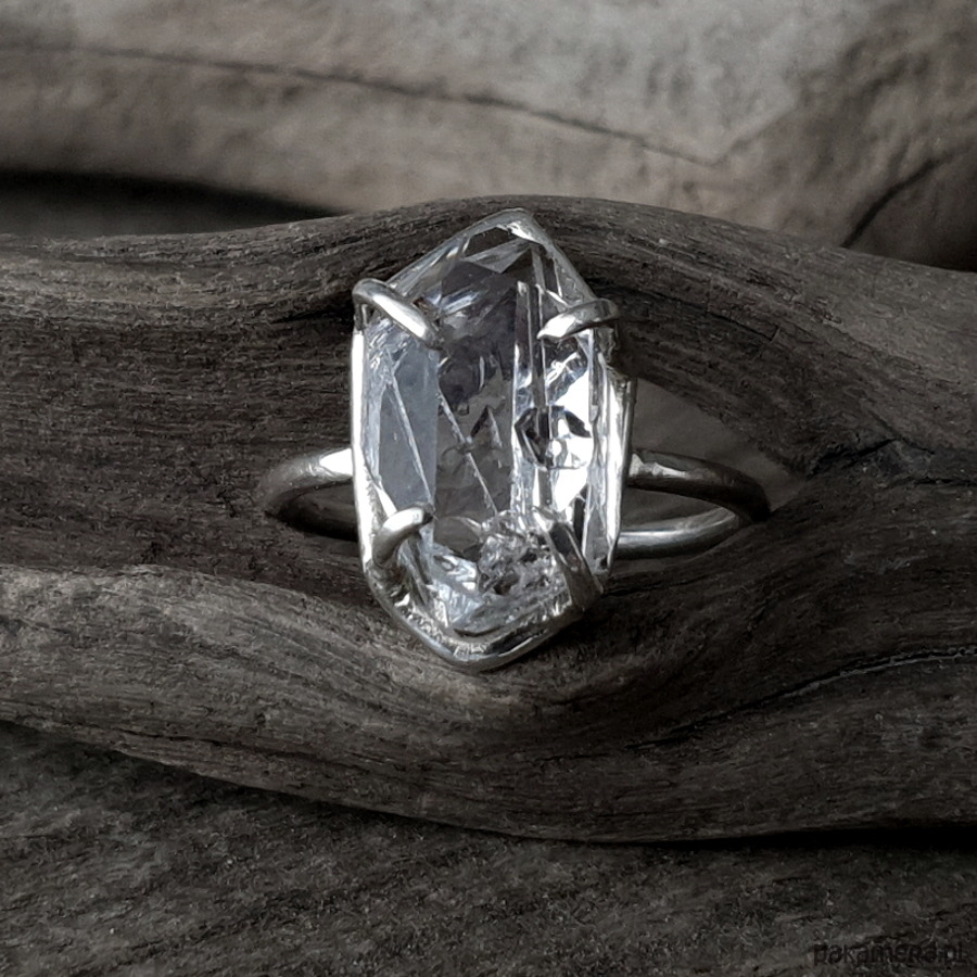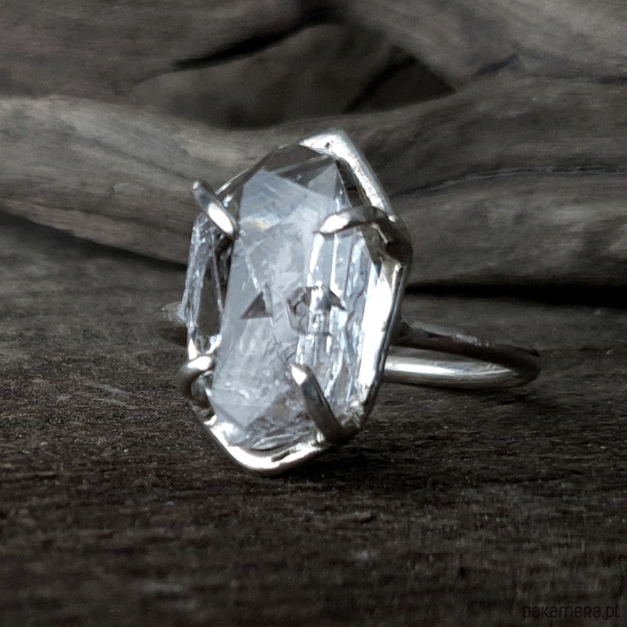 Delikatny, przykuwający wzrok pierścionek, wykonany w całości ręcznie ze srebra próby 930 i 999. Ozdobiony surowym diamentem herkimer. Wymiary korony pierścionka 10x17mm. Rozmiar obrączki 12,5 (średnica wewnętrzna 16,5 mm). Pierścionek został zoksydowany i wypolerowany. Biżuteria zostanie ozdobnie zapakowana.