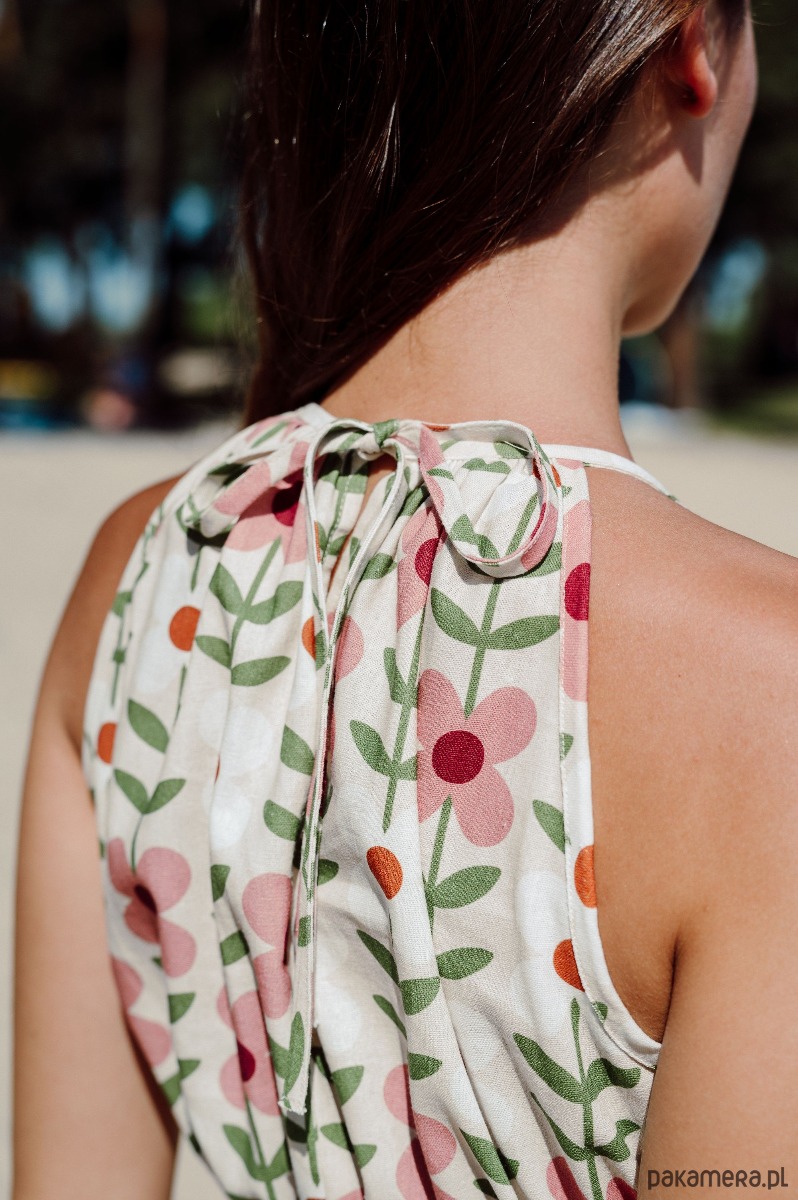 Regulacja i dopasowanie: Dzięki wiązaniu z tyłu i marszczeniom świetnie układa się na sylwetce.