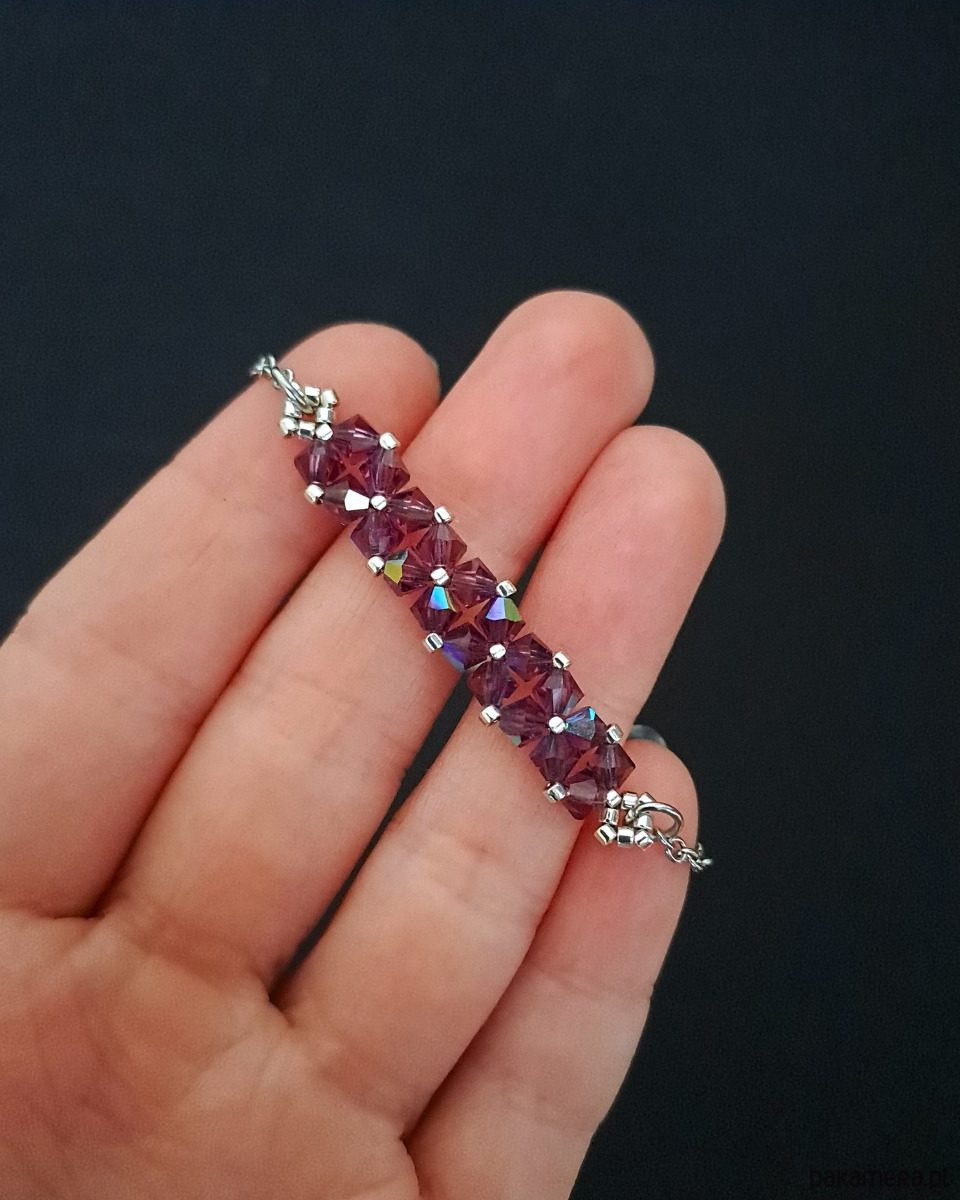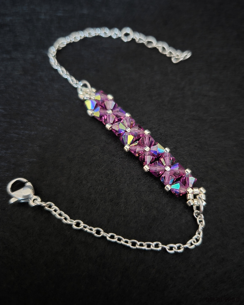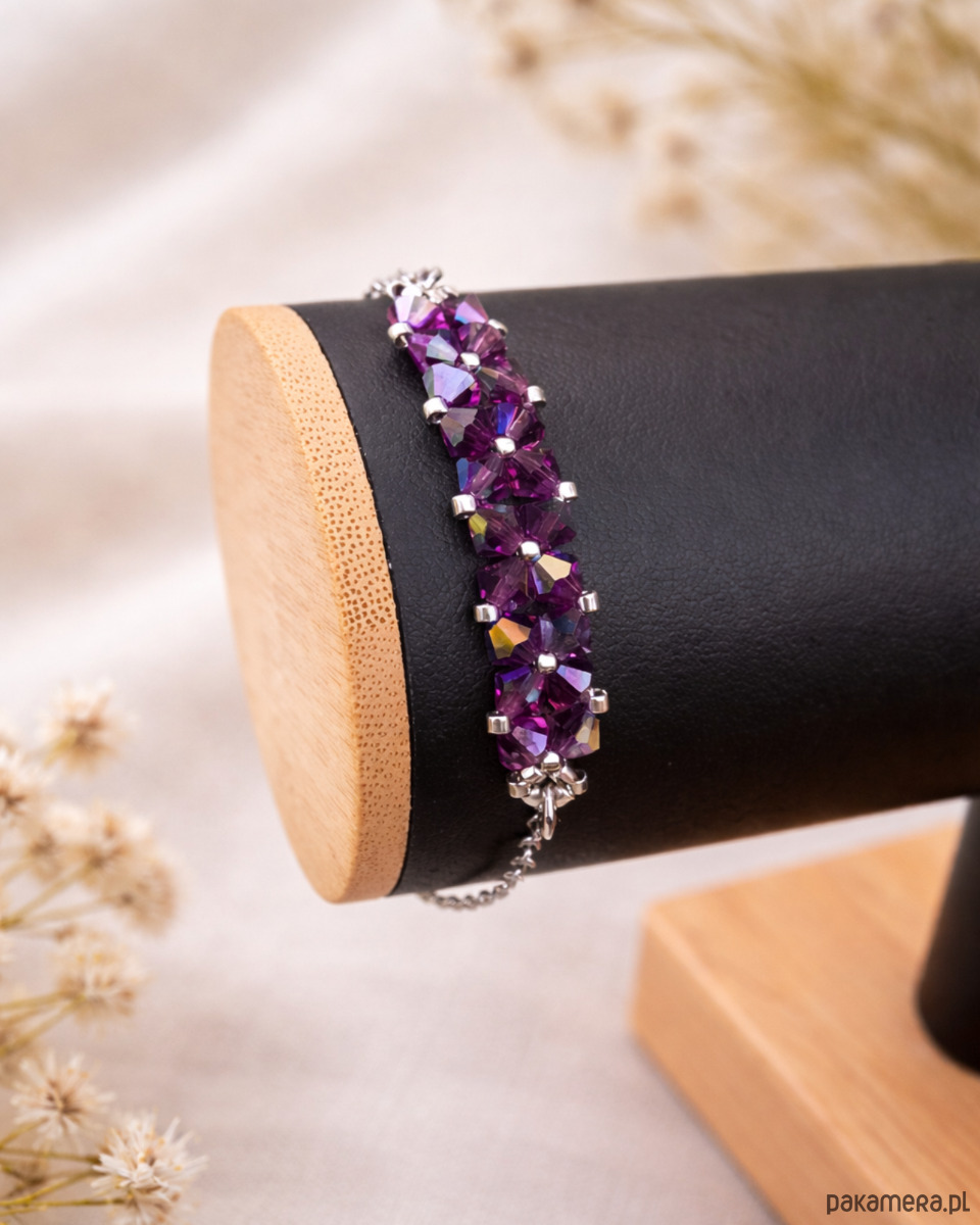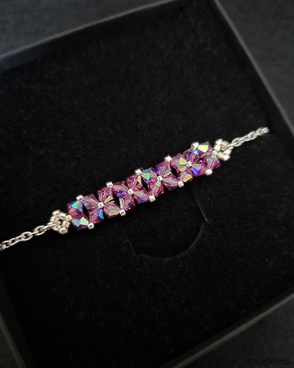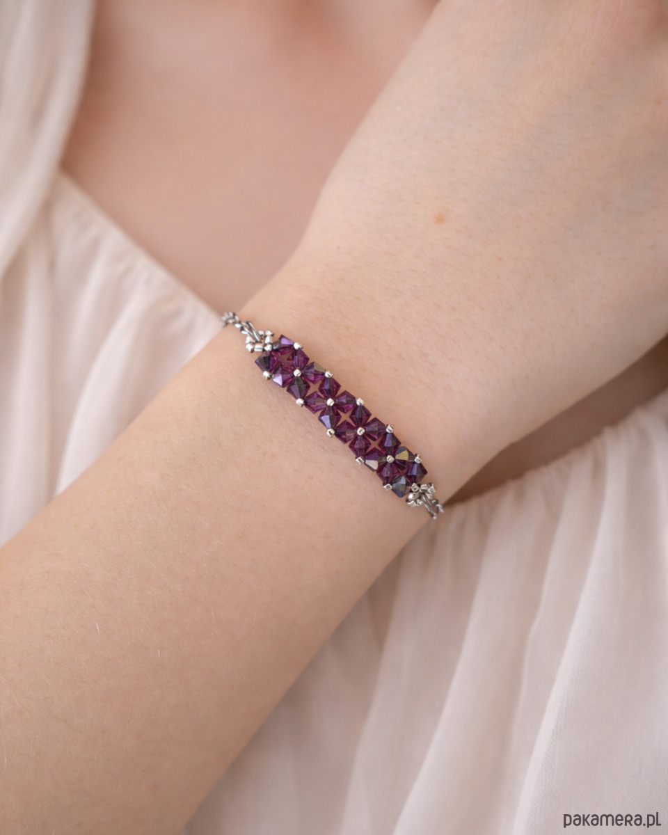 Bransoletka powstaje z kryształków Preciosa w kolorze Amethyst, które dzięki opalizującemu wykończeniu zachwycają wielobarwną grą światła, nadającą biżuterii dynamiczny, szlachetny charakter. Towarzyszą im drobne koraliki Miyuki Delica w srebrnym odcieniu, znane z wyjątkowej regularności i precyzji wykonania.