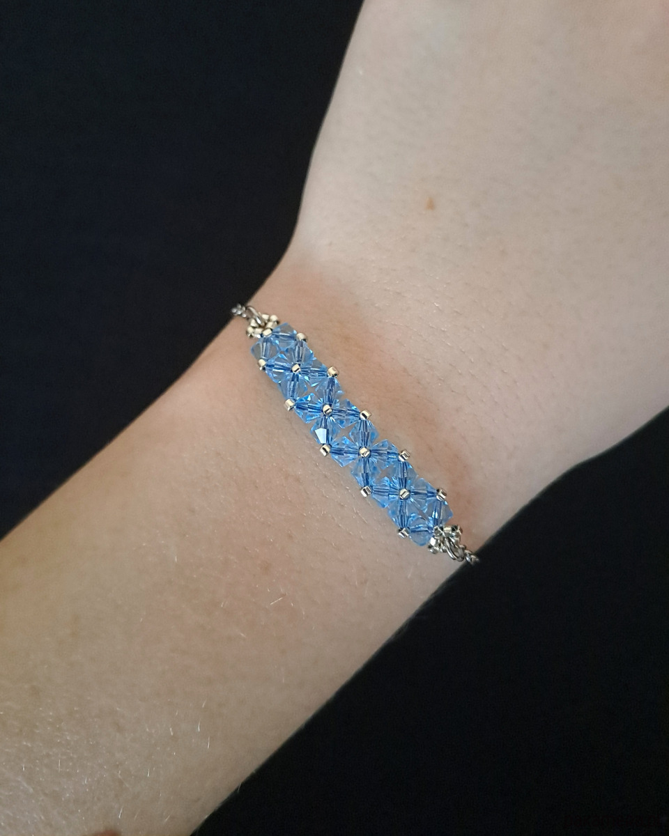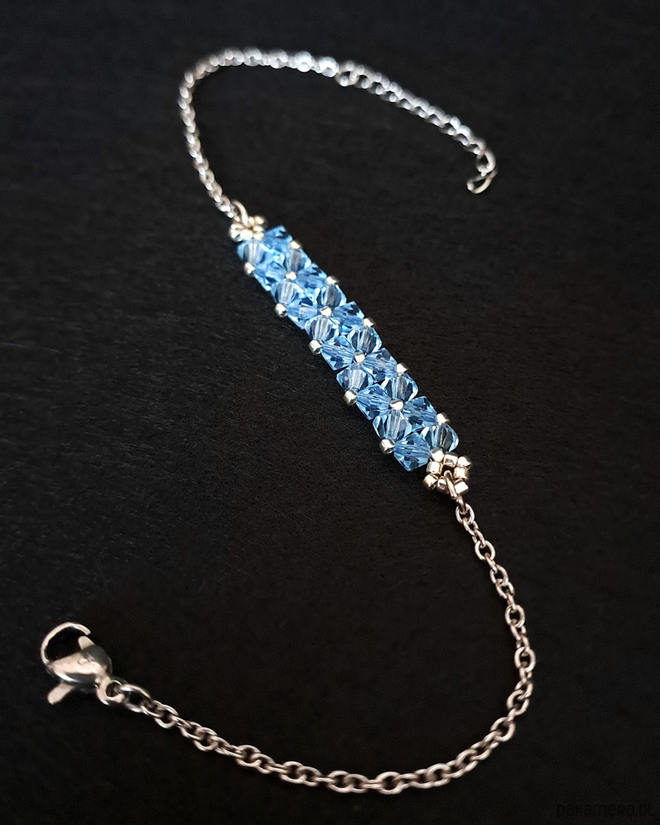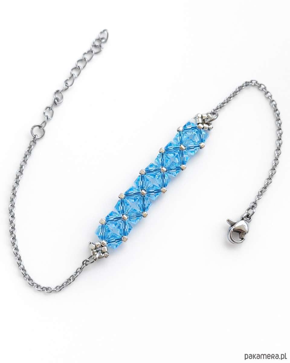Bransoletka powstaje z kryształków Preciosa w kolorze Aquamarine, które pięknie odbijają światło, ukazując intensywny, chłodny odcień błękitu. Towarzyszą im drobne koraliki Miyuki Delica w srebrnym odcieniu, znane z wyjątkowej regularności i precyzji wykonania.