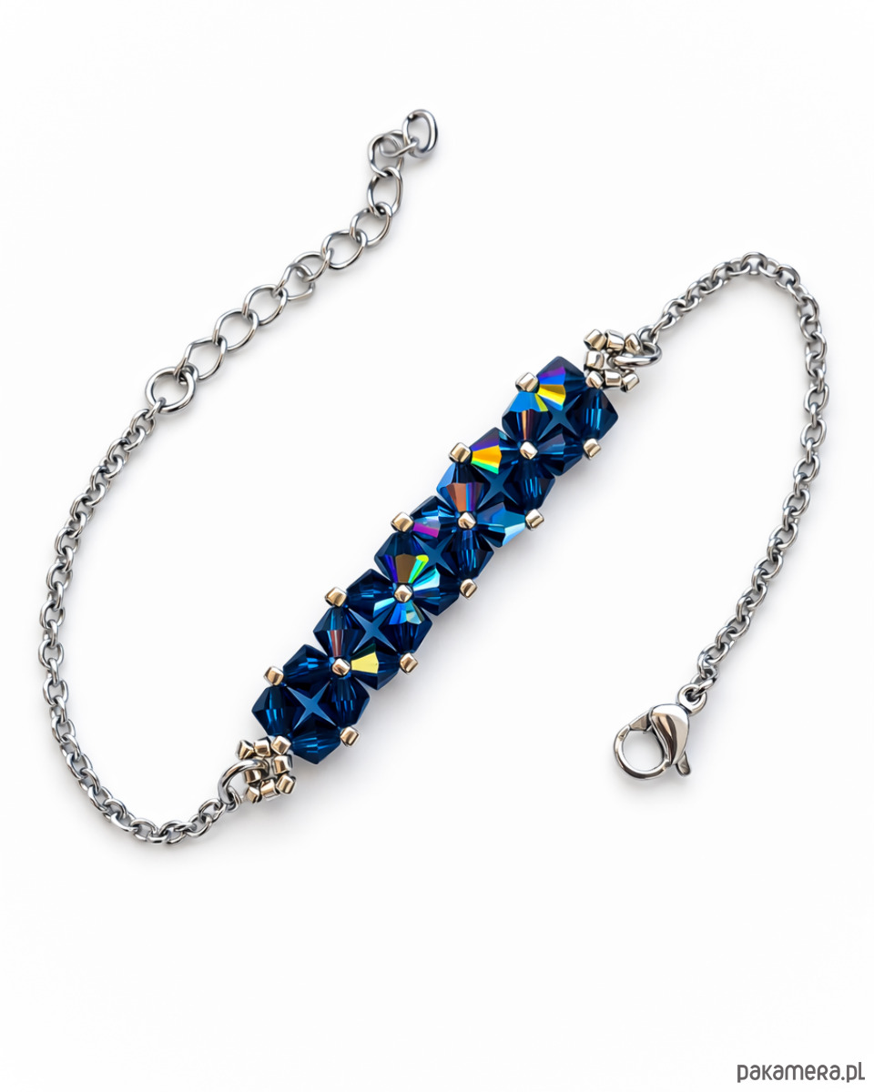 Bransoletka stworzona z kryształków Preciosa w kolorze Montana AB, które dzięki opalizującemu wykończeniu zachwycają wielobarwną grą światła, nadającą biżuterii dynamiczny, szlachetny charakter. Towarzyszą im drobne koraliki Miyuki Delica w srebrnym odcieniu, znane z wyjątkowej regularności i precyzji wykonania.