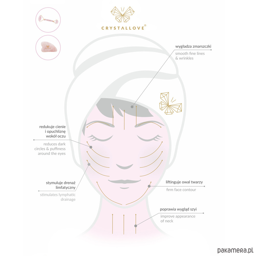 Stwórz swój własny rytuał pielęgnacyjny za pomocą luksusowej i wyjątkowej płytki do masażu twarzy gua sha marki CRYSTALLOVE, która wykonana została z bursztynu bałtyckiego. Masaż twarzy płytką gua sha redukuje opuchliznę i cienie pod oczami, skóra nabiera blasku i świeżości, poprawia się jej elastyczność. Masaż stymuluje drenaż limfatyczny oraz krążenie wspomagając dotlenienie i oczyszczenie skóry z toksyn, łagodzi napięcie mięśni twarzy. Zmarszczki i drobne linie spłycają się. Masaż działa liftingująco poprawiając owal twarzy. Konturuje kości policzkowe i podnosi opadające łuki brwiowe. Dodatkowo bursztyn posiada swoją naturalną i niepowtarzalną barwę, wyjątkowe właściwości, energia kamienia uspokaja i przynosi równowagę. Idealny do wszystkich typów cery.