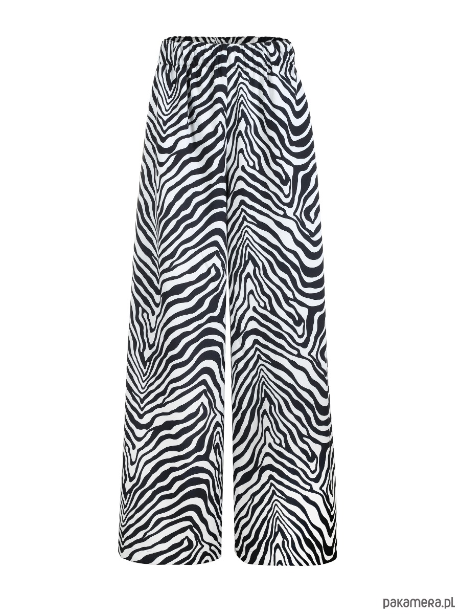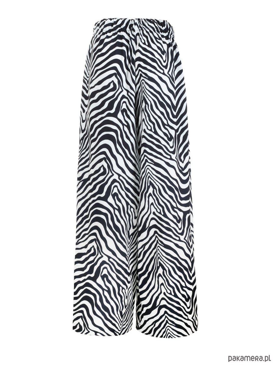 Spodnie z szeroką nogawkę posiadają gumkę w pasie, po bokach kieszenie.