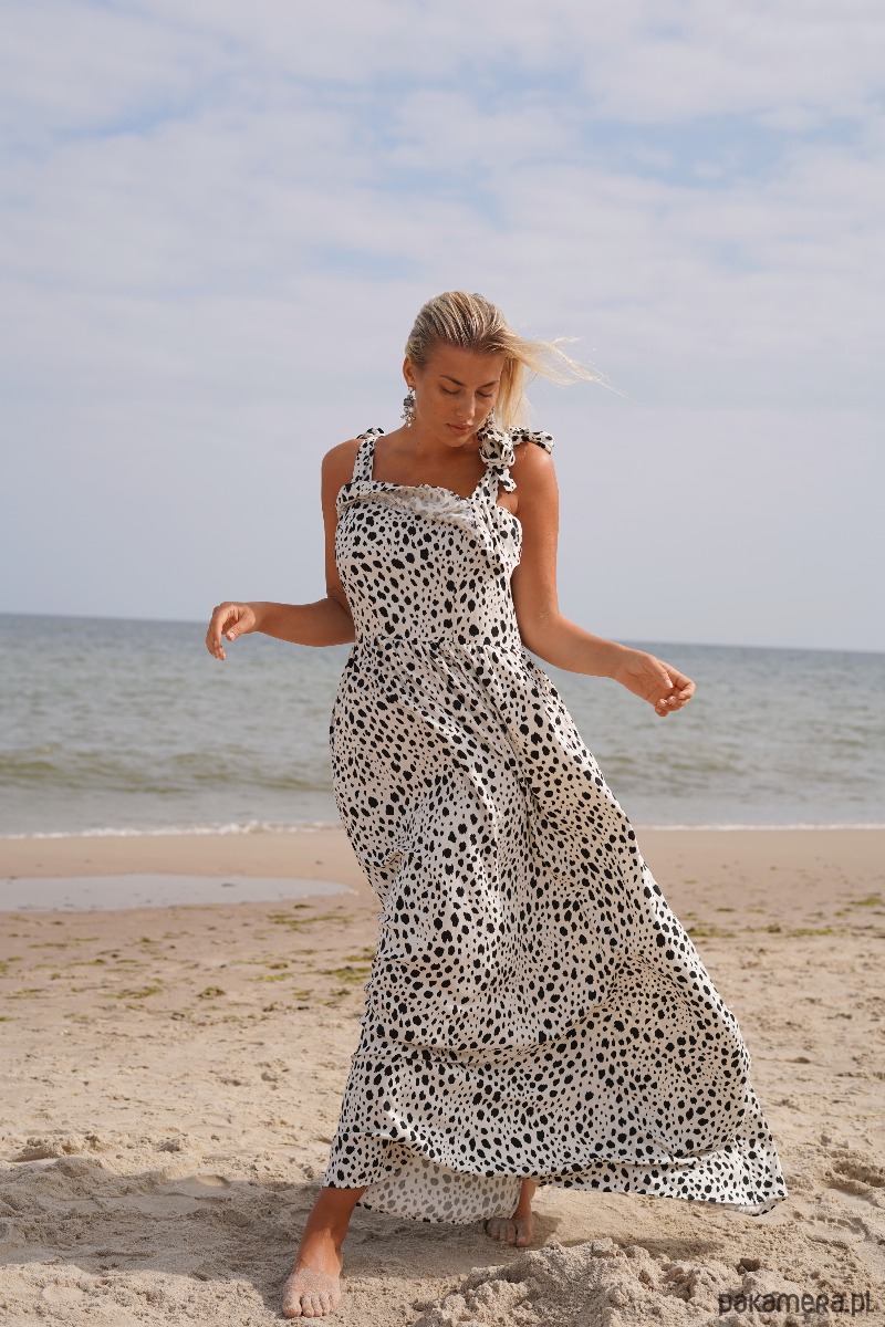 CS - lniana sukienka maxi w cętki wiązana na grube ramiączka.