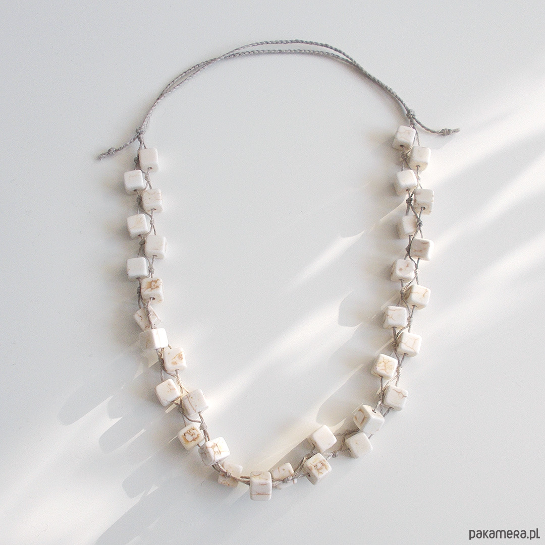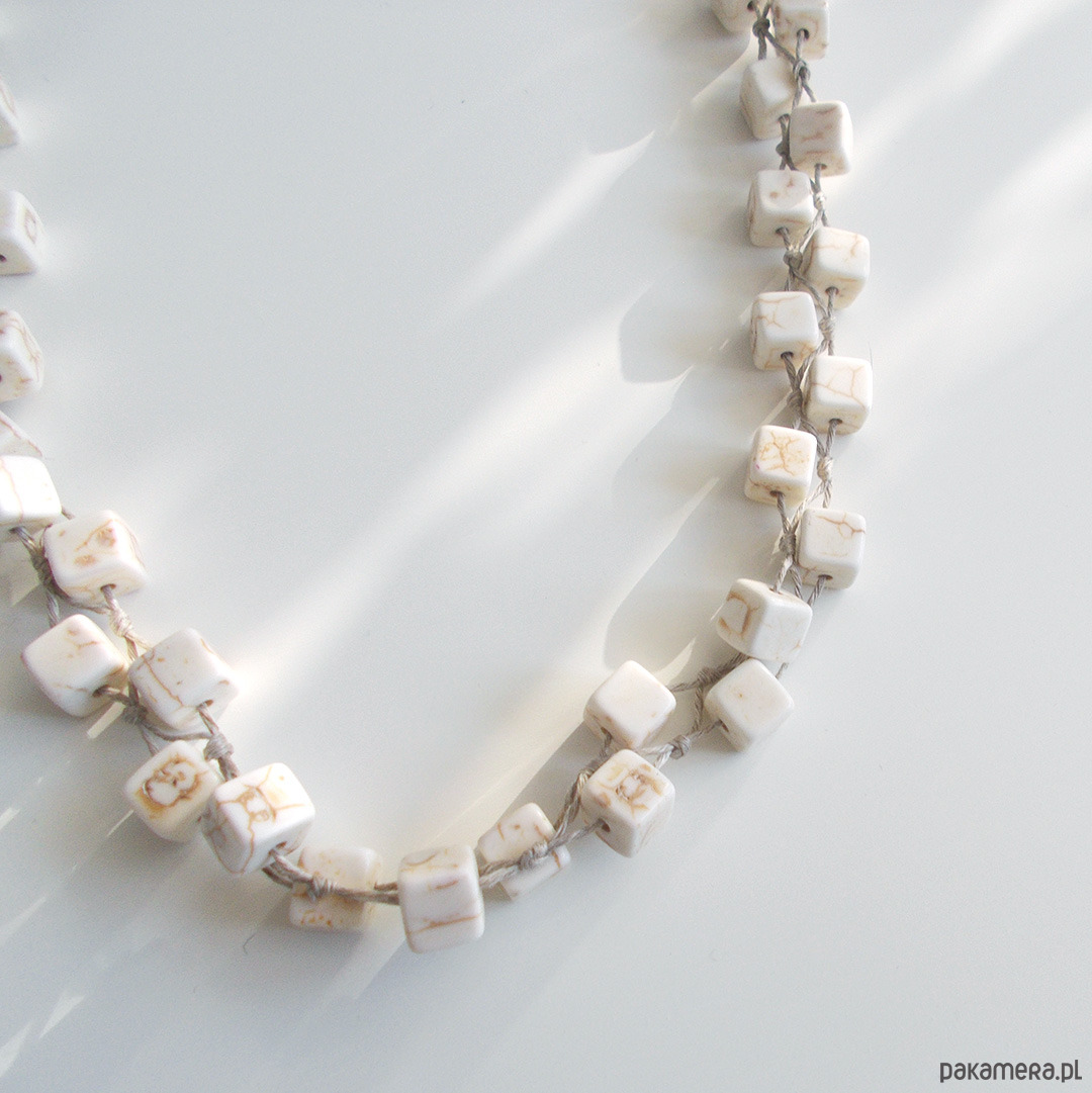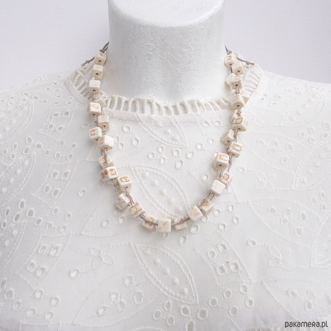 Naszyjnik w naturalnych, miękkich kolorach wykonany z kostek howlitu i naturalnego lnu