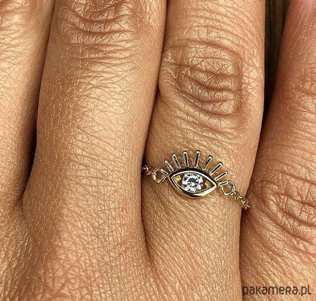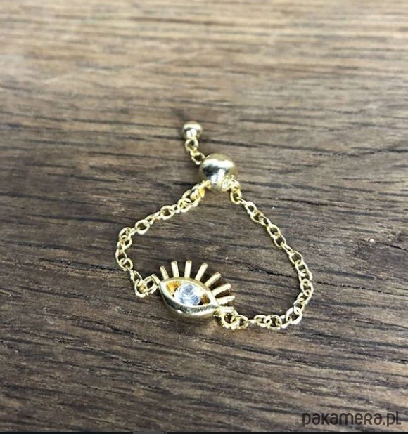 Modny pierścionek na łańcuszku z okiem. Całość wykonana ze srebra 925 solidnie pozłoconego 24kt złotem.