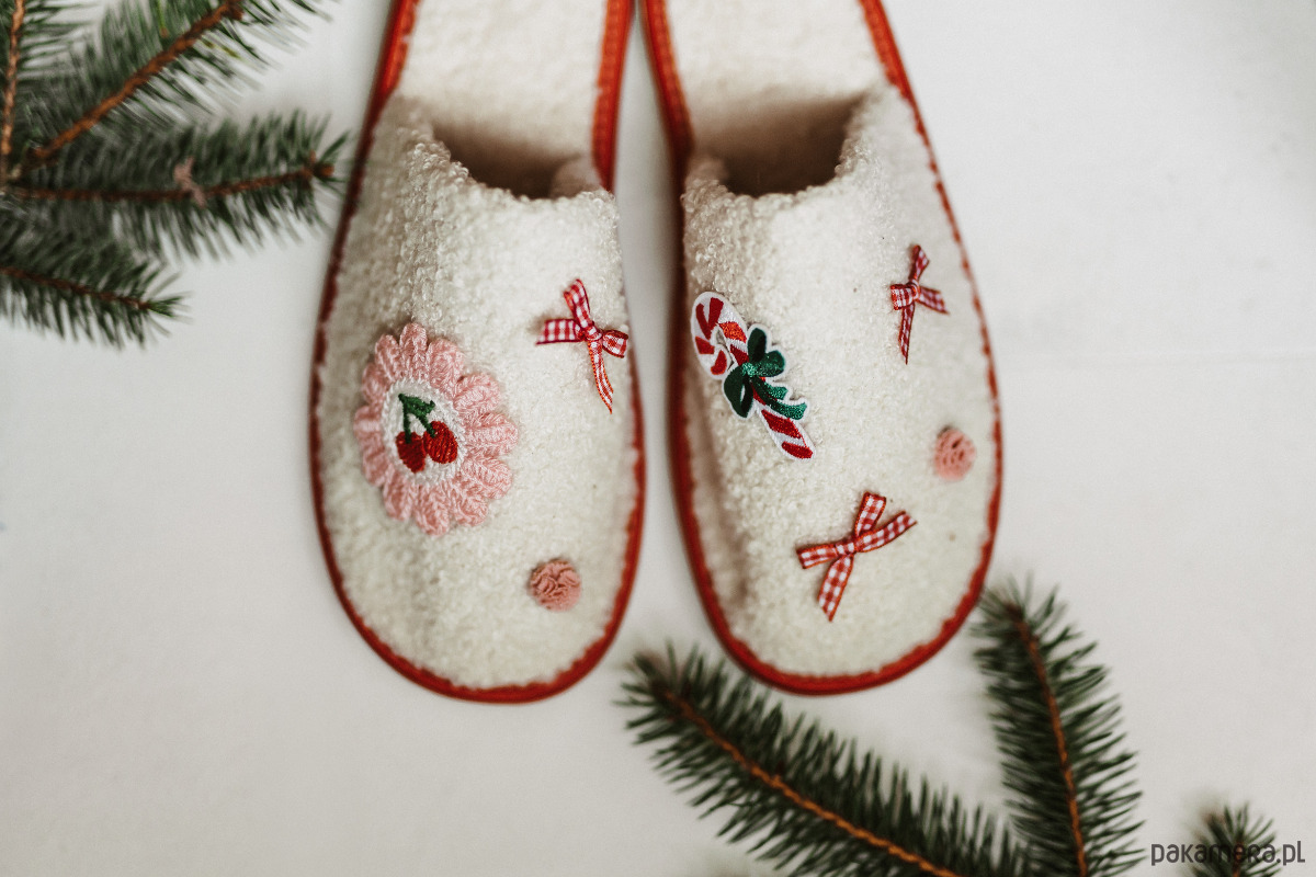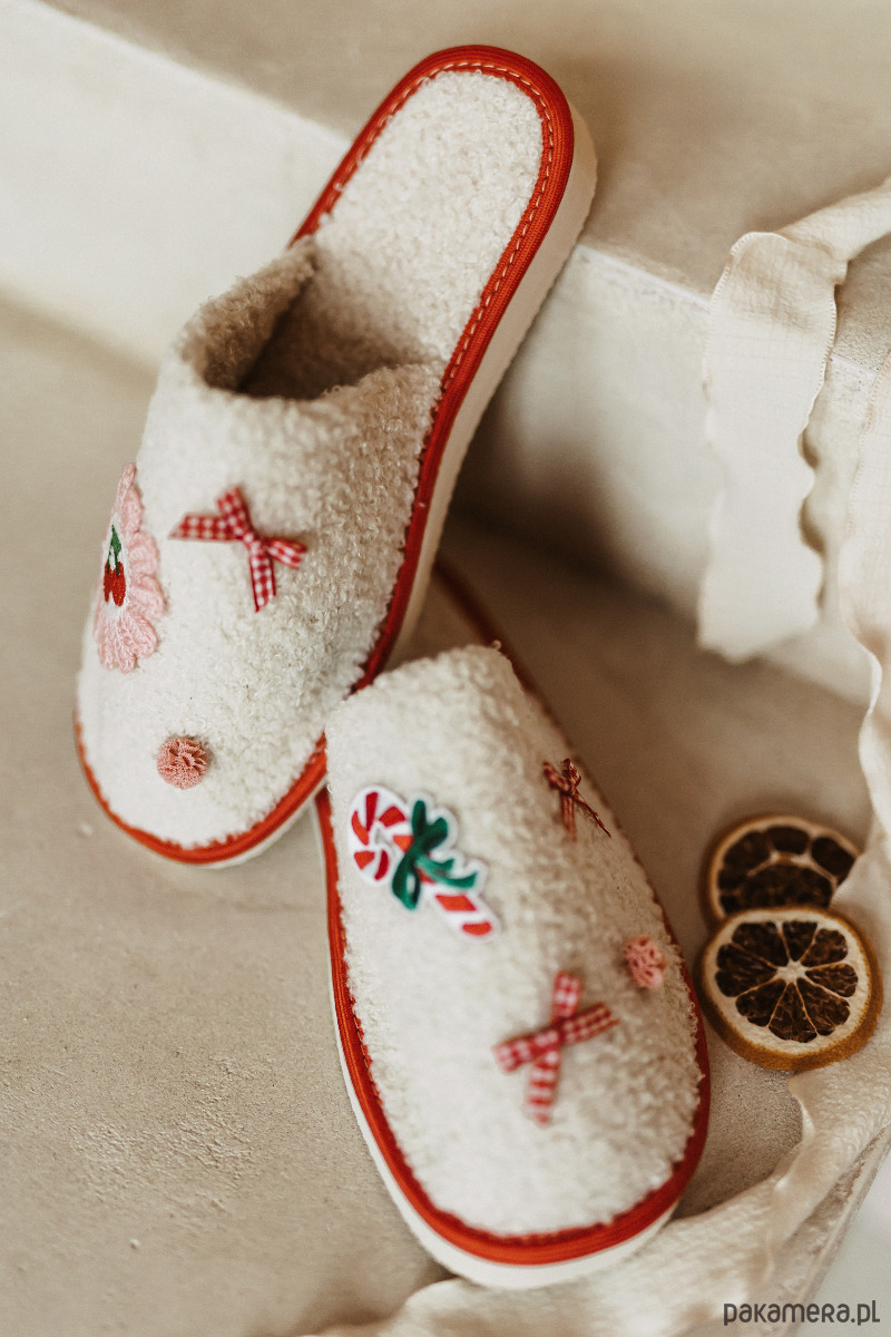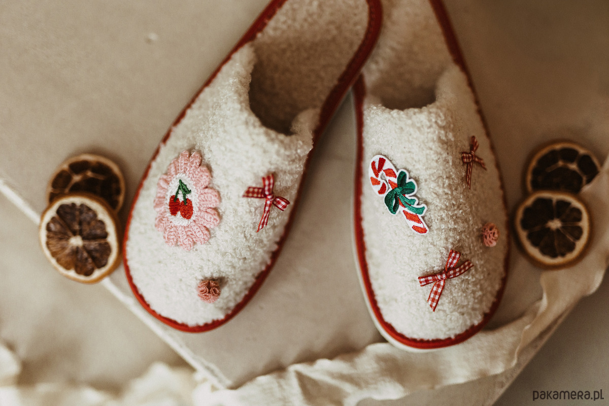 Kapcie słodkie i urocze, niczym z magicznej świątecznej krainy! Ozdobione pięknymi kokardkami i małą laseczką cukrową - idealne, jeśli kochasz słodkie detale i przytulny klimat. Miękkie, ciepłe i bardzo wygodne, wymarzone do noszenia przy ubieraniu choinki, pakowaniu prezentów lub pieczeniu świątecznych słodkości.