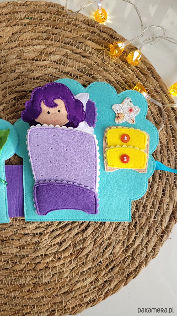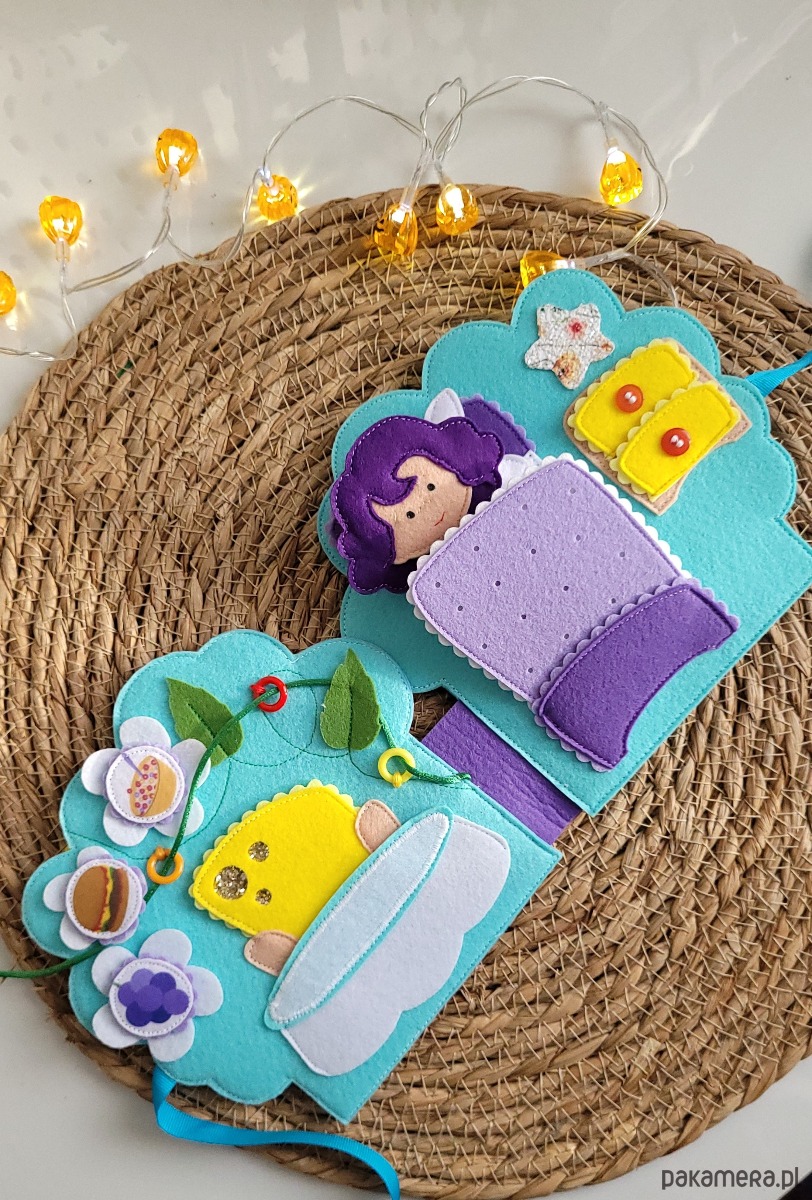 Materiał: filc koreański, sztywnik, rzep, wstążka, guziki, sznurek, kółka.