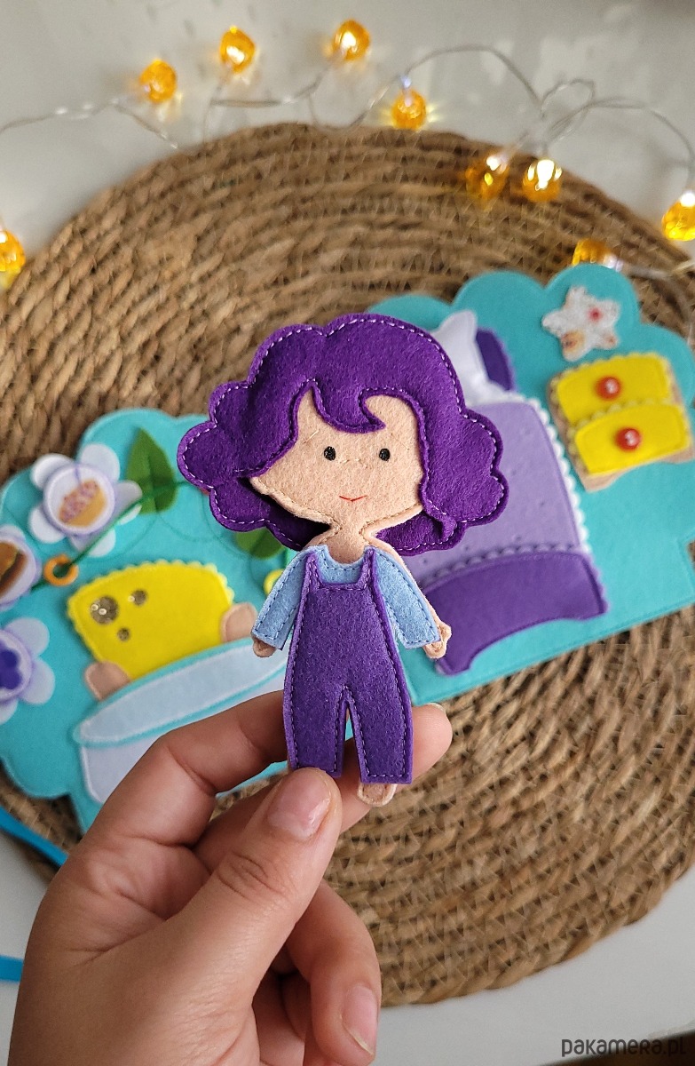 Domek oferuje także sznureczek do nauki przeplatania, co wspiera rozwój motoryki małej dziecka. Kolejna część domku to sypialnia z łóżeczkiem dla lalki, gdzie znajduje się odczepiana poduszeczka oraz szafeczka, w której schowane są książeczki.