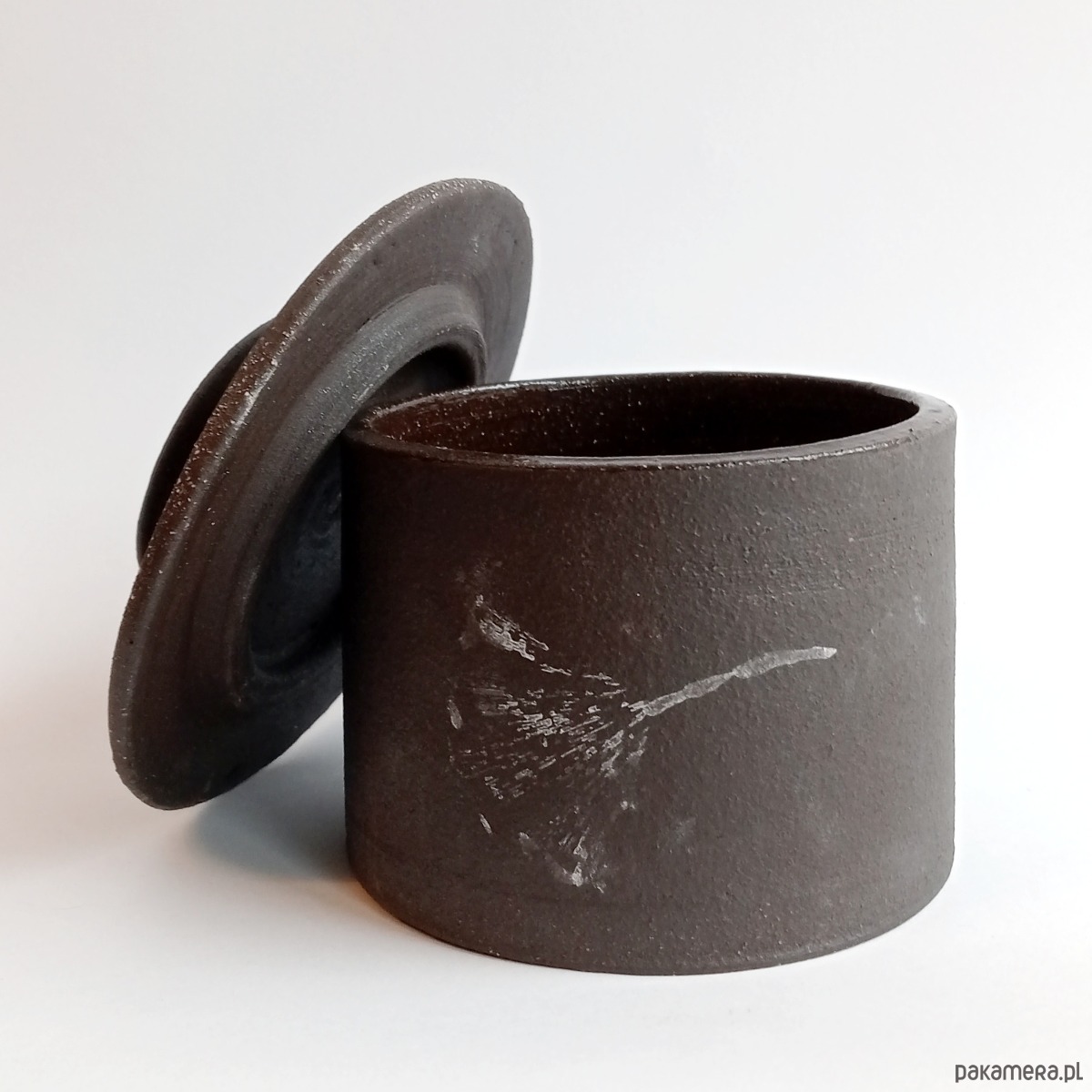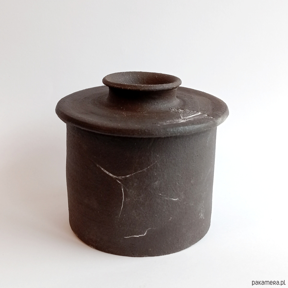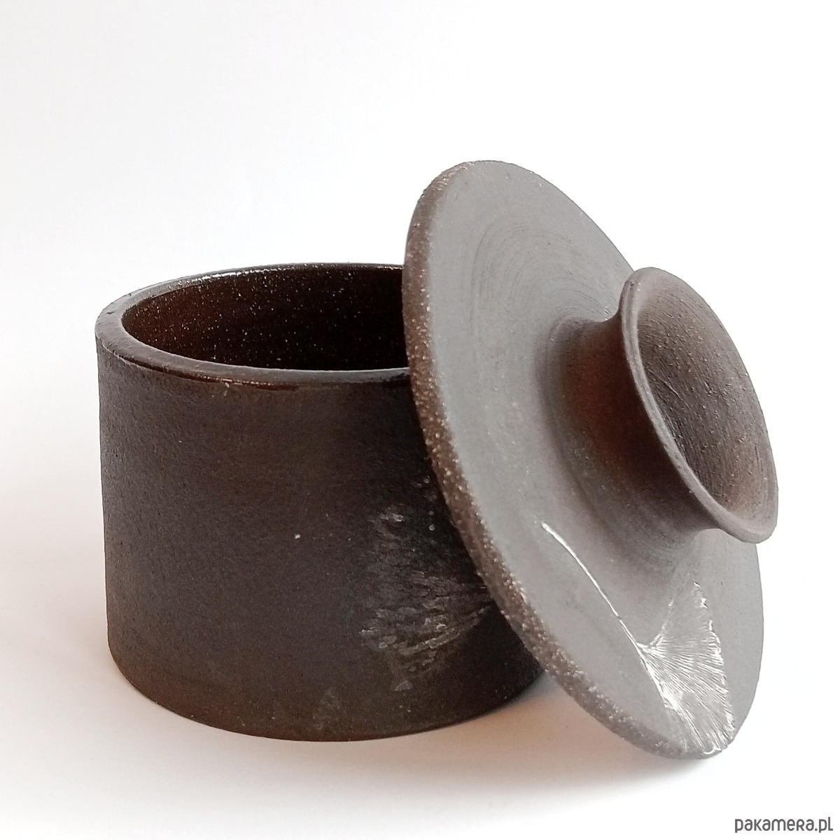 Cukiernica z ciemnej, pełnej szamotu, więc ciekawej w dotyku gliny.
