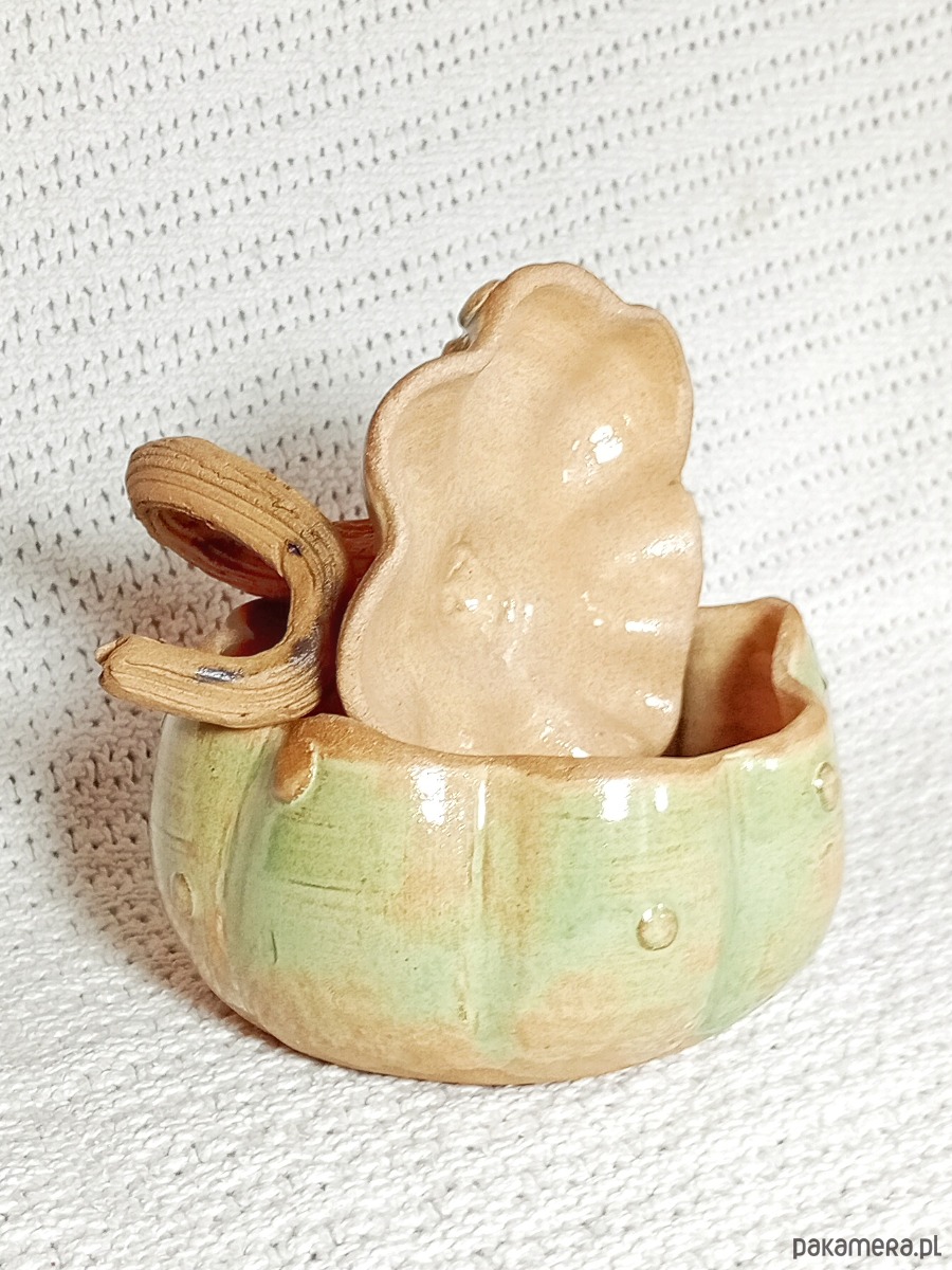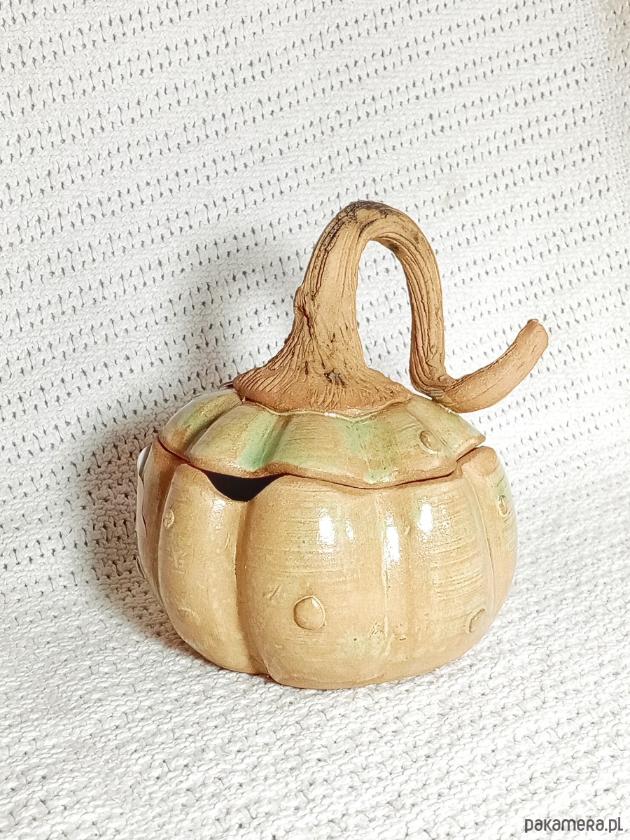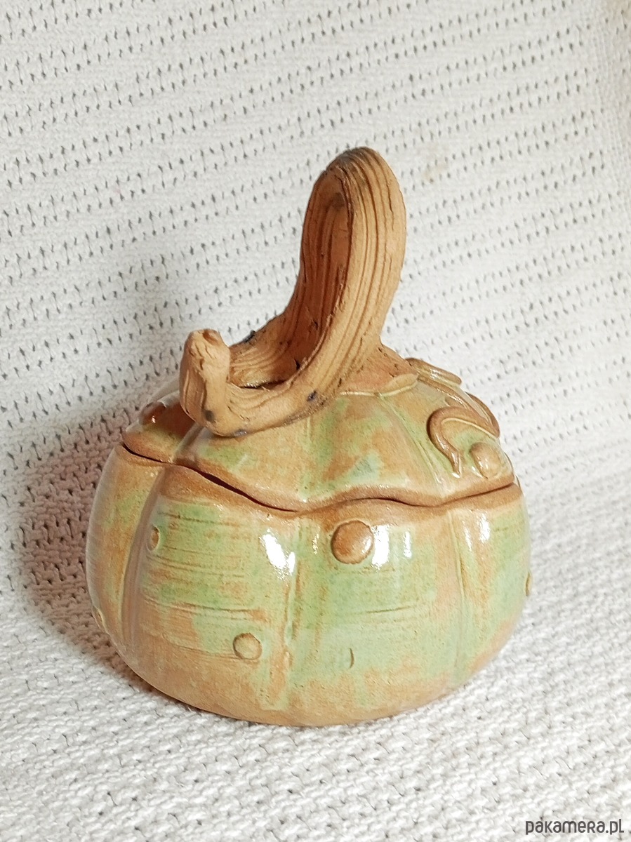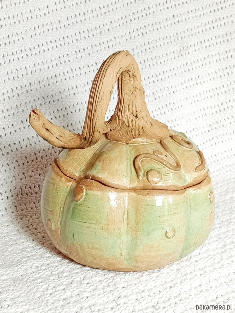 Cukiernica-dynia wykonana ręcznie na kole garncarskim. Szkliwiona, jasnozielona z wypustkami. Wewnętrze poszkliwione szkliwem transparentnym. Z dekoracyjną, matową łodyżką i ciemnymi przetarciami, która służy jako uchwyt pokrywki cukiernicy. Posiada wycięcie na łyżeczkę. Na dole logo.