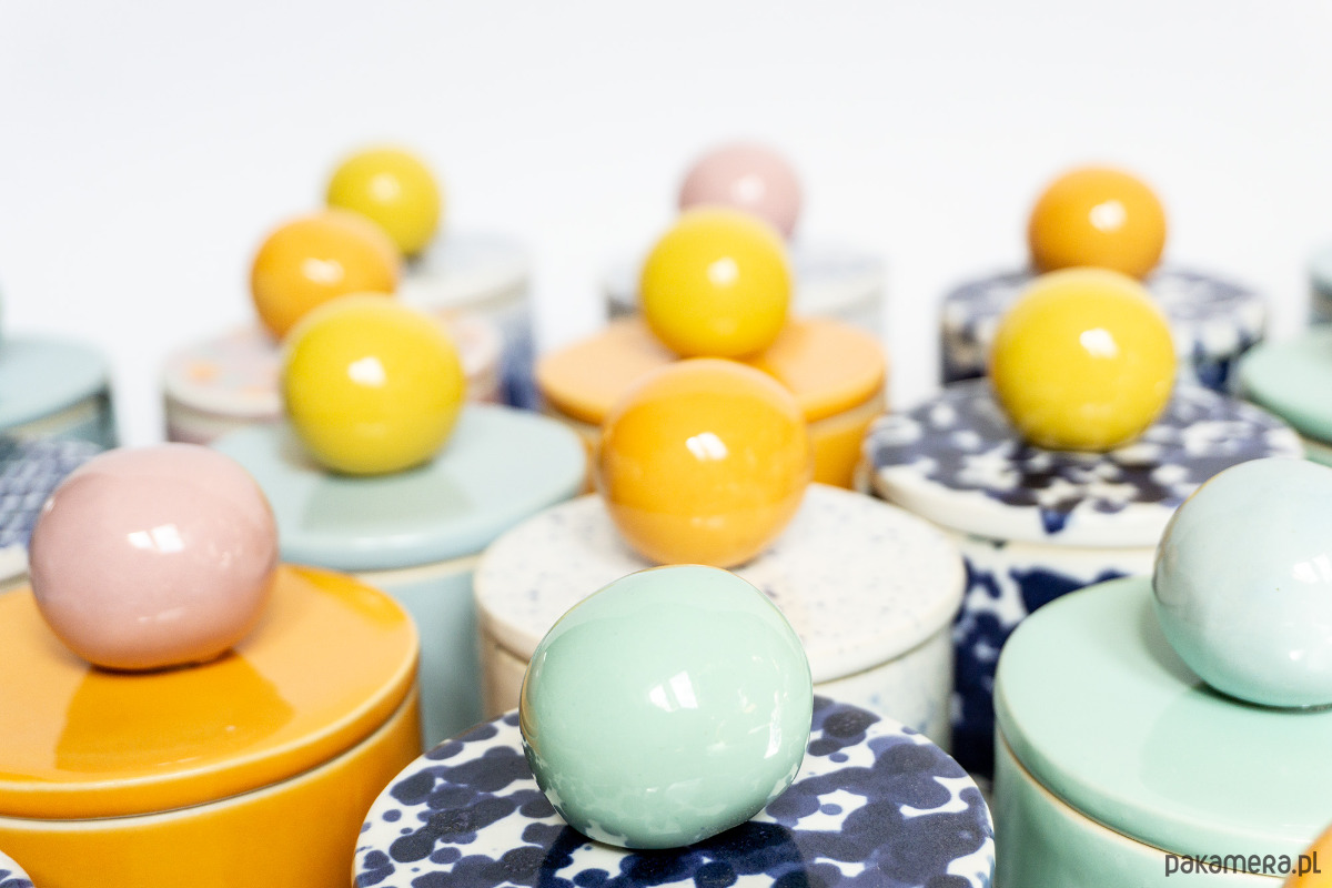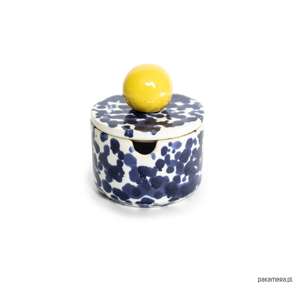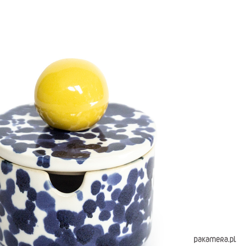 Prosta w formie cukiernica z otworem na łyżeczkę w ściance naczynia. Z uchwytem w kształcie sporej żółtej kuli, w kobaltowe chlapki. Wykonana z wysoko palonej masy kamionkowej. Wniesie dużo radości do wnętrza!