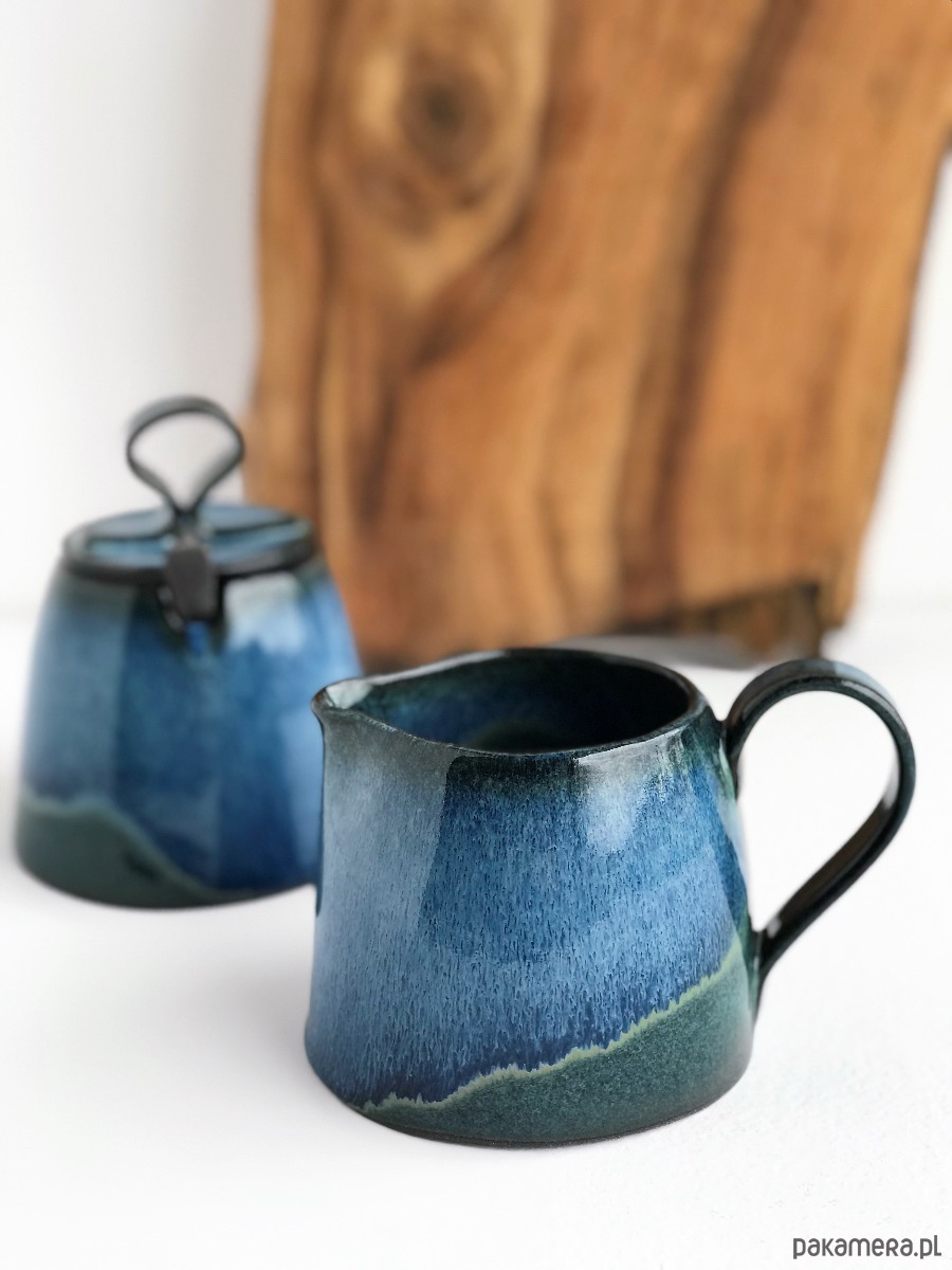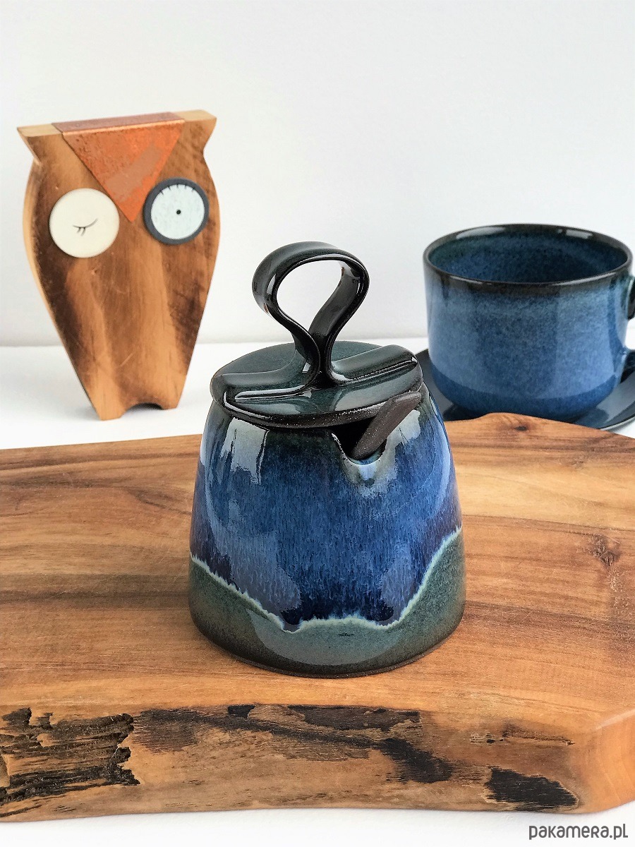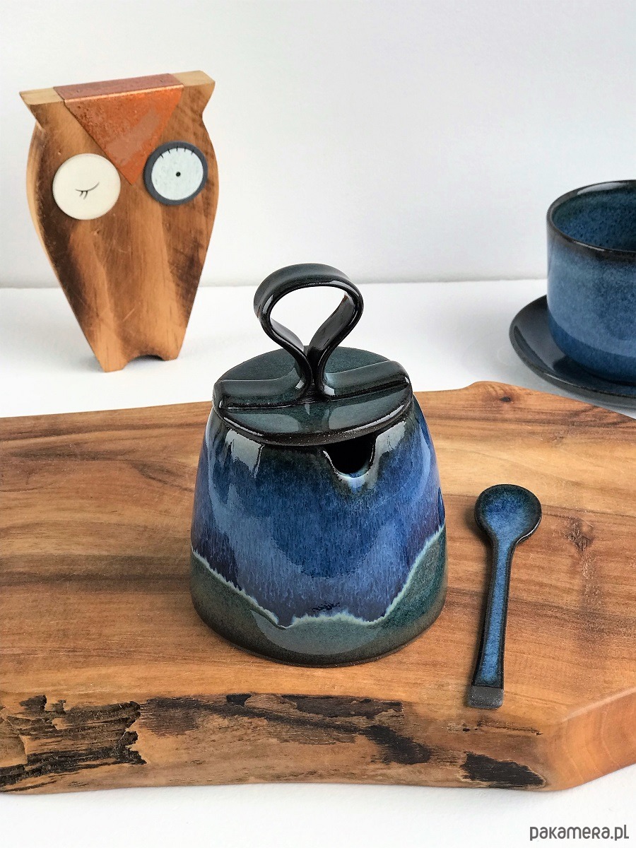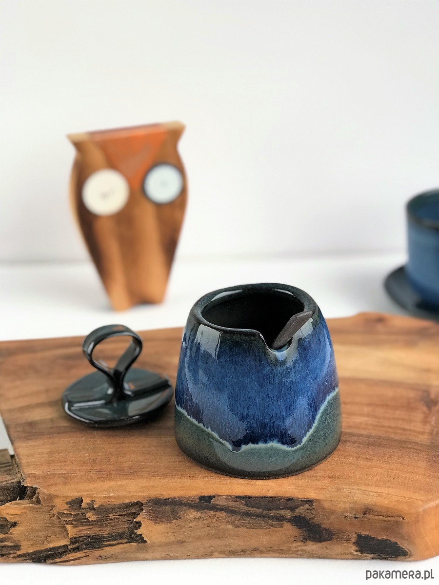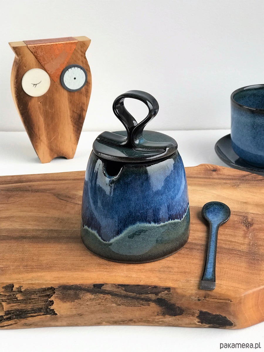 Ręcznie lepiona i formowana cukiernica ceramiczna z ozdobną łyżeczka oraz mlecznikiem w odcieniach: granatu, niebieskiego, zieleni, szarości i czerni.