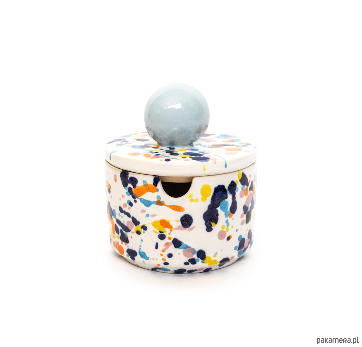 Prosta w formie cukiernica z otworem na łyżeczkę w ściance naczynia. Z uchwytem w kształcie sporej błękitnej kuli, w kolorowe chlapki. Wykonana z wysoko palonej masy kamionkowej. Wniesie dużo radości do wnętrza!