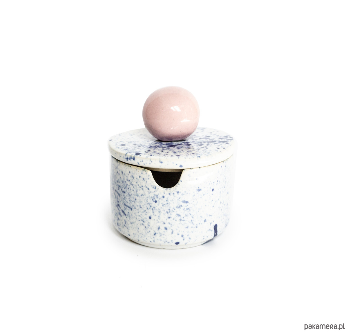 Prosta w formie cukiernica z otworem na łyżeczkę w ściance naczynia. Z uchwytem w kształcie sporej różowej kuli, w kobaltowe chlapki. Wykonana z wysoko palonej masy kamionkowej. Wniesie dużo radości do wnętrza!