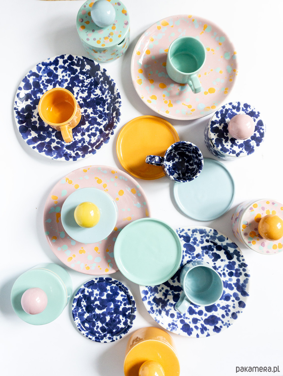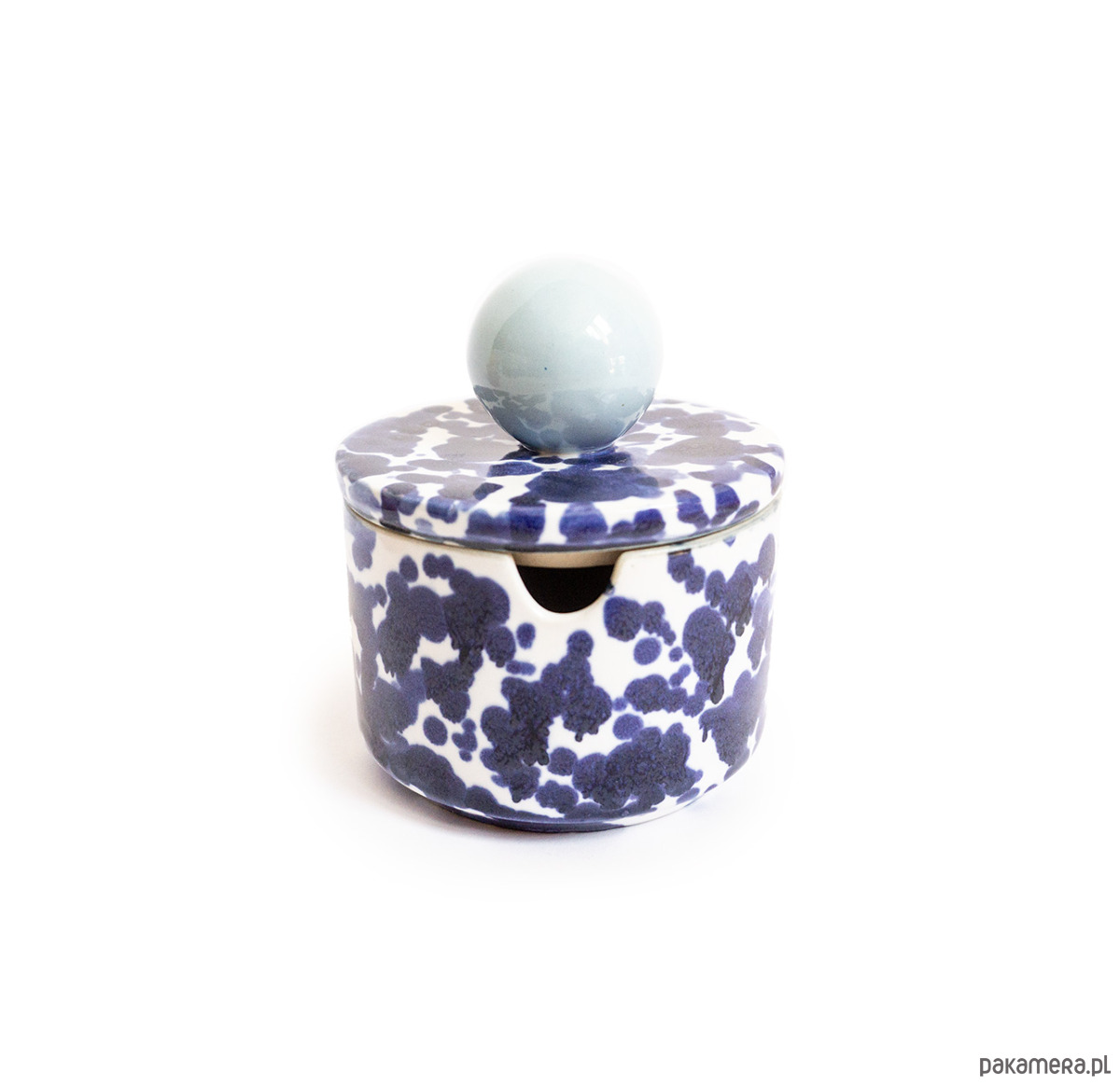 Prosta w formie cukiernica z otworem na łyżeczkę w ściance naczynia. Z uchwytem w kształcie sporej błękitnej kuli, w kobaltowe chlapki. Wykonana z wysoko palonej masy kamionkowej. Wniesie dużo radości do wnętrza!