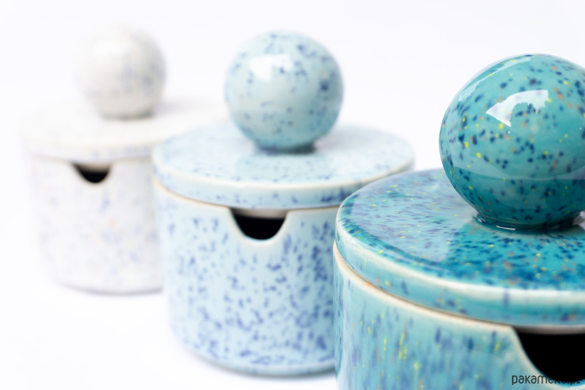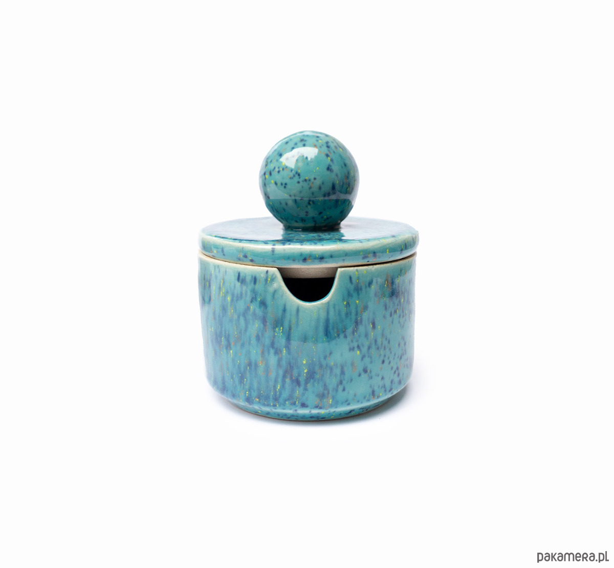 Prosta w formie cukiernica z otworem na łyżeczkę w ściance naczynia. Z uchwytem w kształcie sporej kuli. Wykonana z wysoko palonej masy kamionkowej, szkliwo w kolorze morsko zielonym w drobny kolorowy rzucik. Wniesie dużo radości do wnętrza.