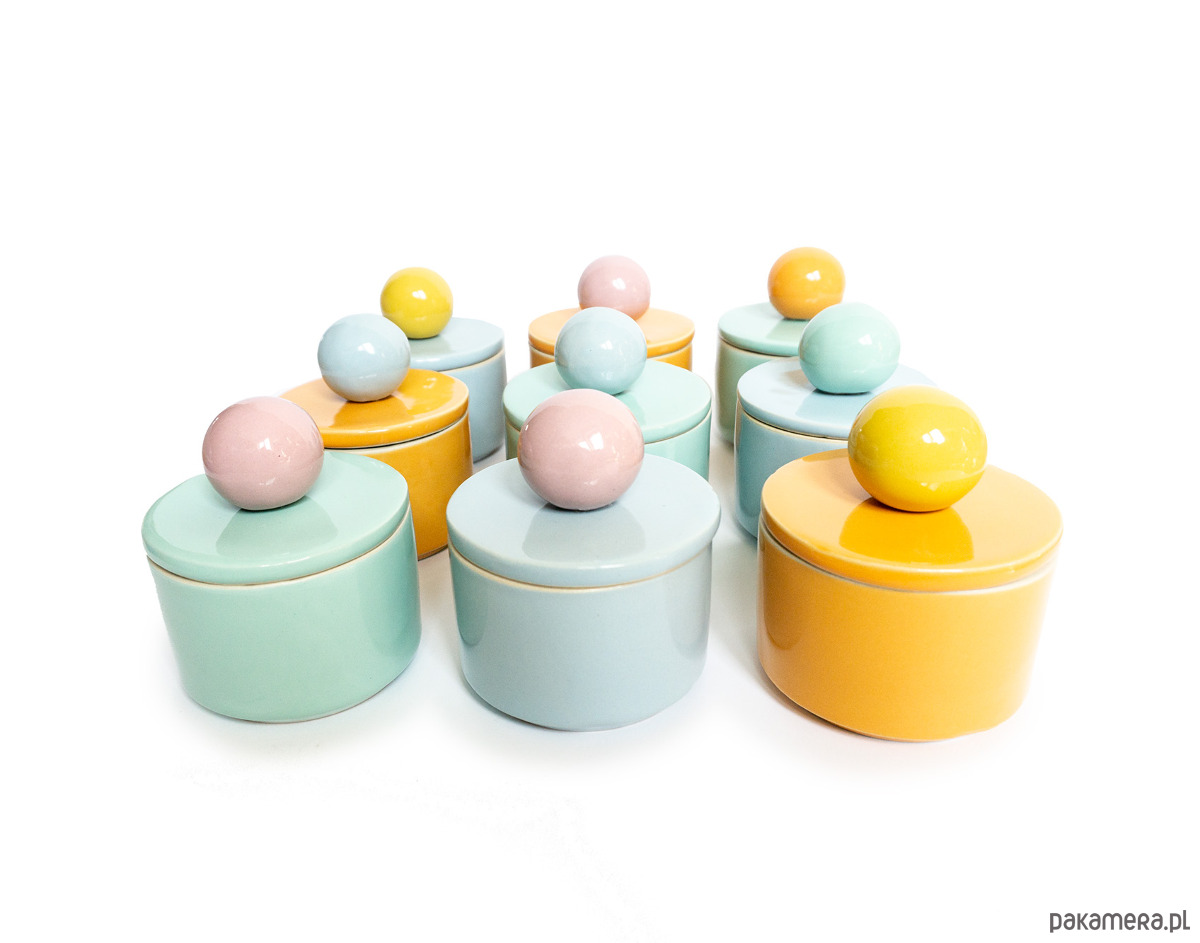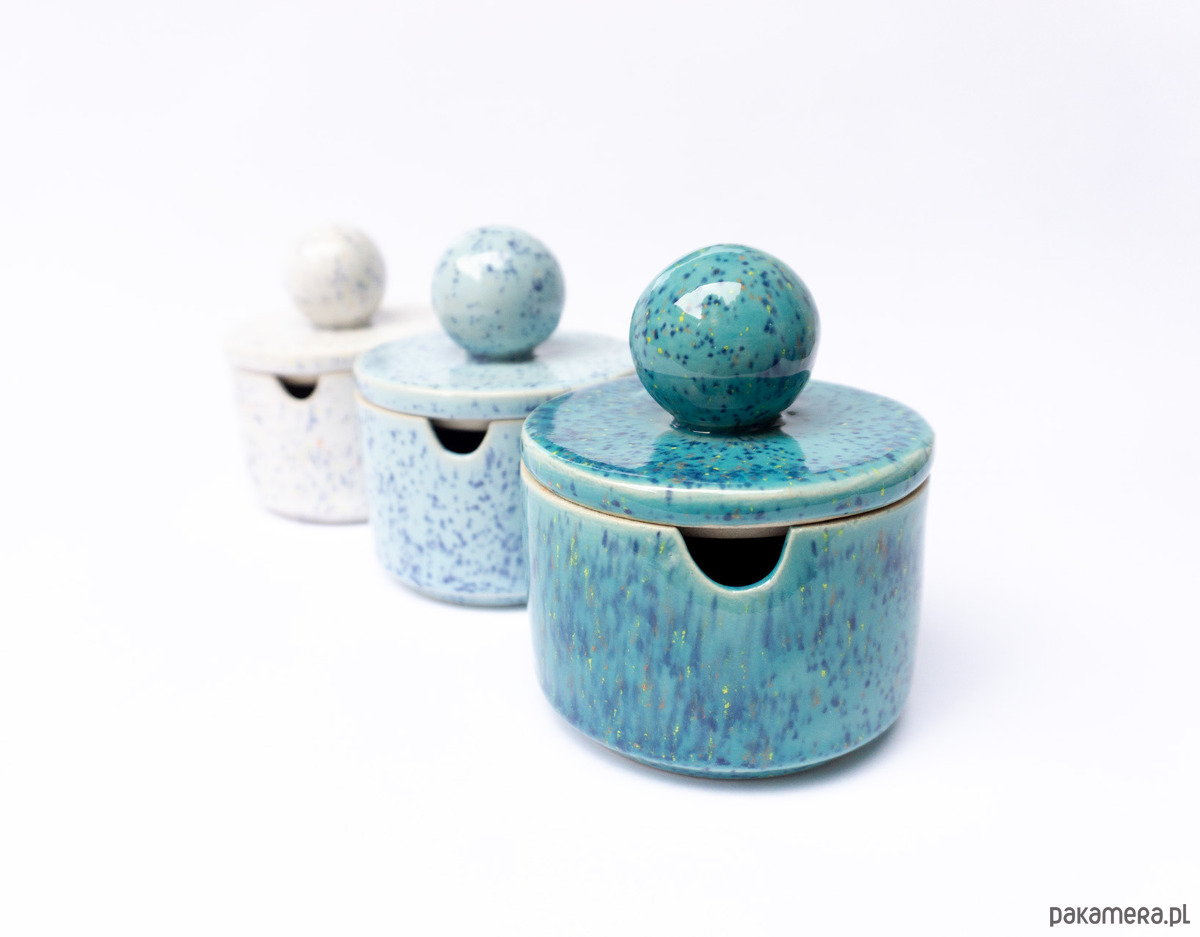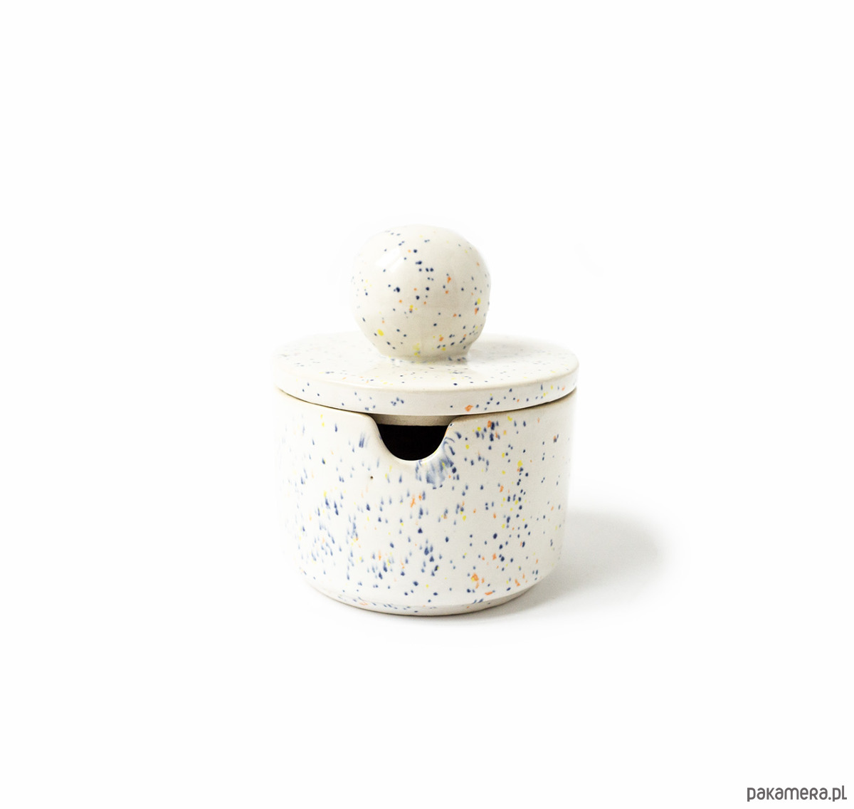 Prosta w formie cukiernica z otworem na łyżeczkę w ściance naczynia. Z uchwytem w kształcie sporej kuli. Wykonana z wysoko palonej masy kamionkowej, szkliwo w kolorze białym w drobny kolorowy rzucik. Wniesie dużo radości do wnętrza.
