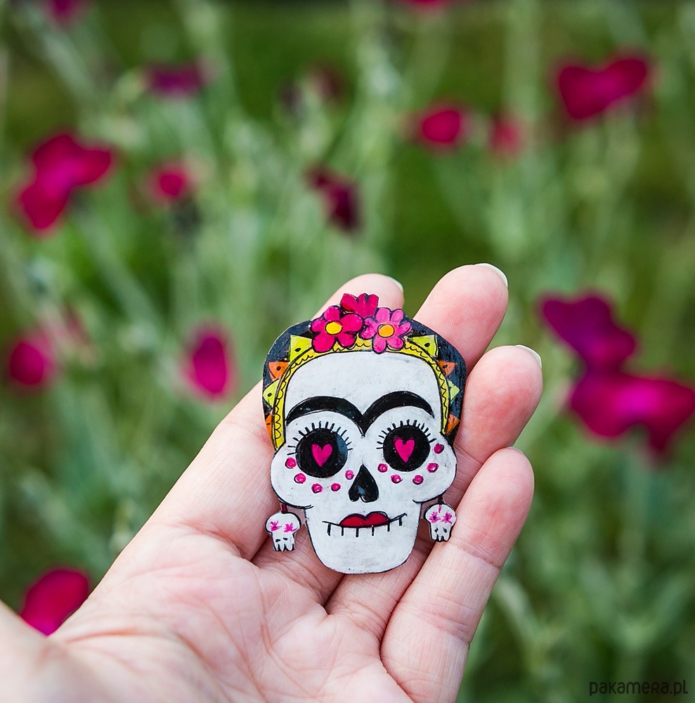 Broszka czaszka została namalowana na folii termokurczliwej.