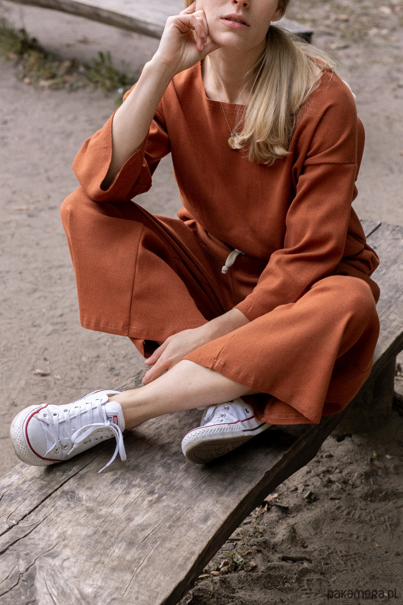 Z jednej strony ultrawygodna, prążkowana dzianina....z drugiej, nie do końca dresowy krój. To przecież kompozycja doskonała na zwykłą/niezwykłą codzienność. Ma być wygodnie i pięknie, bo zasługujemy na to co najlepsze. Efekt końcowy zależy od dodatków, a tutaj możemy poszaleć! Minimalistyczny design zestawu pozwala naprawdę na wiele! Trampki, chusta, oversizowy płaszcz.....na co tylko masz ochotę.