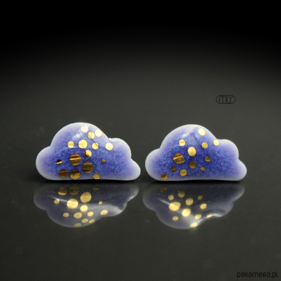 Oryginalne ceramiczne kolczyki w formie sztyftów, ręcznie wykonane delikatnej porcelany, jednostronnie szkliwione mieszanką fioletowych szkliw dekorowane złotymi plamkami, na antyalergicznych sztyftach w kolorze srebrnym. Długość ok 15mm. Polecam