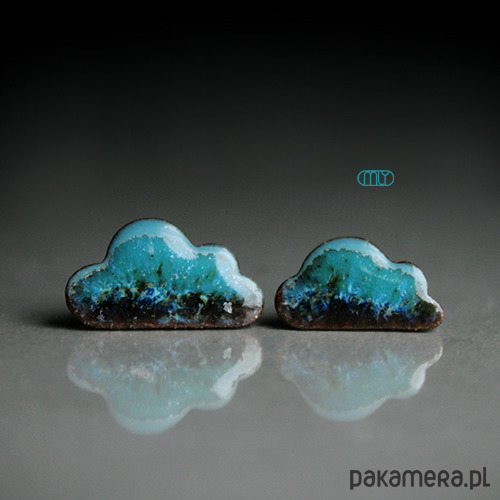Oryginalne ceramiczne kolczyki w formie sztyftów, ręcznie wykonane z gliny kamionkowej, jednostronnie szkliwione mieszanką błękitnych i zielonych szkliw z efektem drobnych plamek, na antyalergicznych sztyftach w kolorze srebrnym. Długość ok 17 i 15mm. Polecam