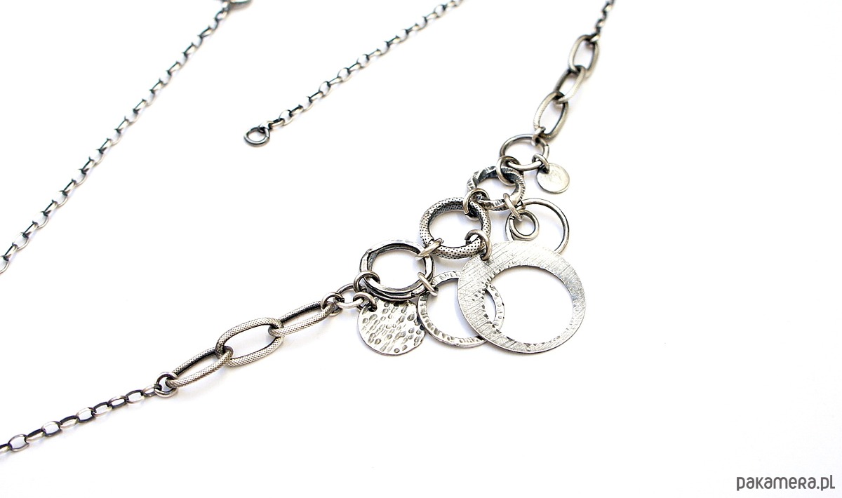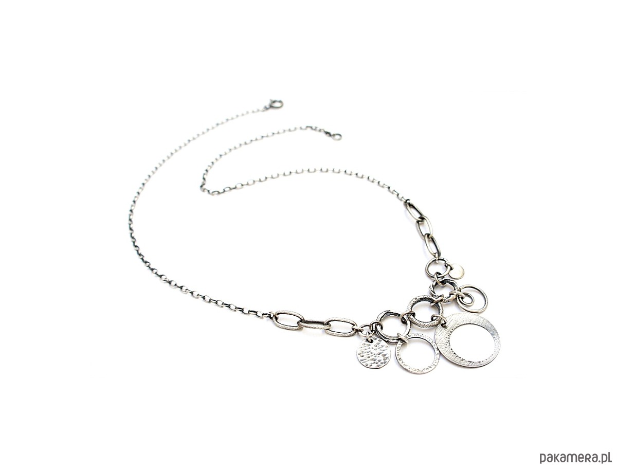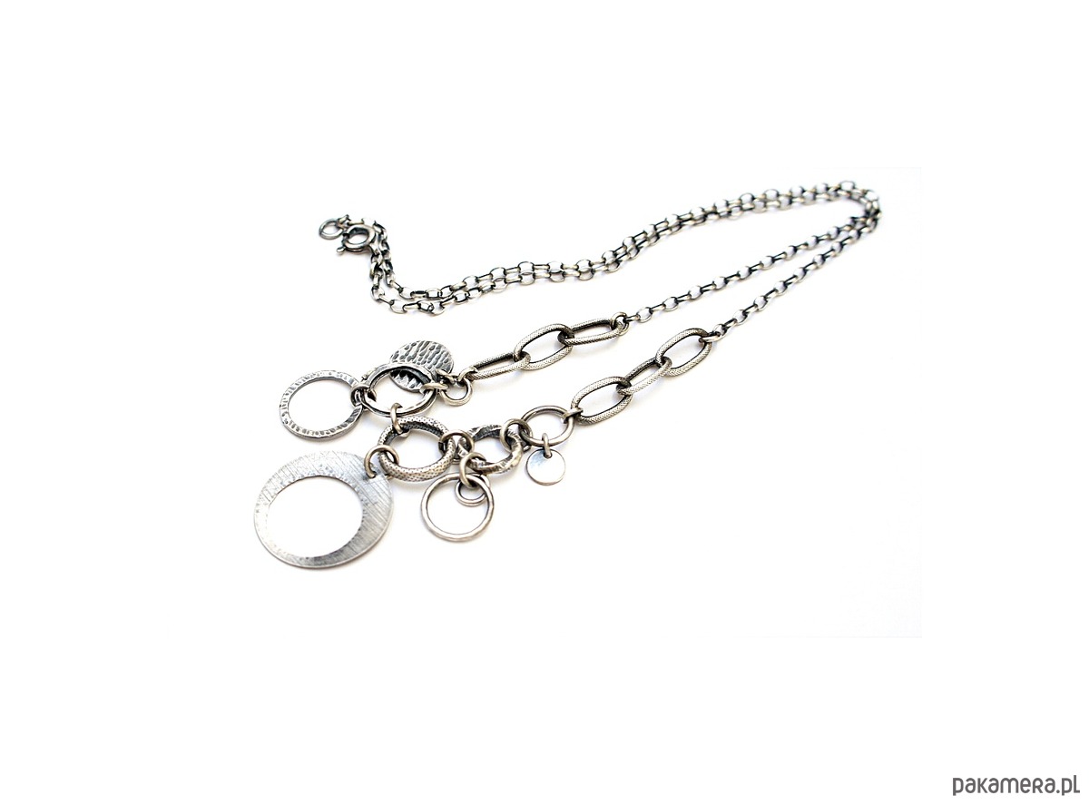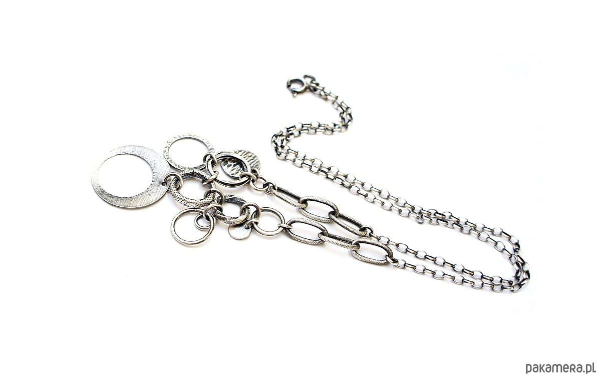 Naszyjnik wykonany w całości ze srebra [pr. 925] w połączeniu z zawieszkami o surowej strukturze. Srebro oksydowane i przetarte. Całkowita długość łańcuszka około 44,5cm. Biżuteria ozdobnie zapakowana.