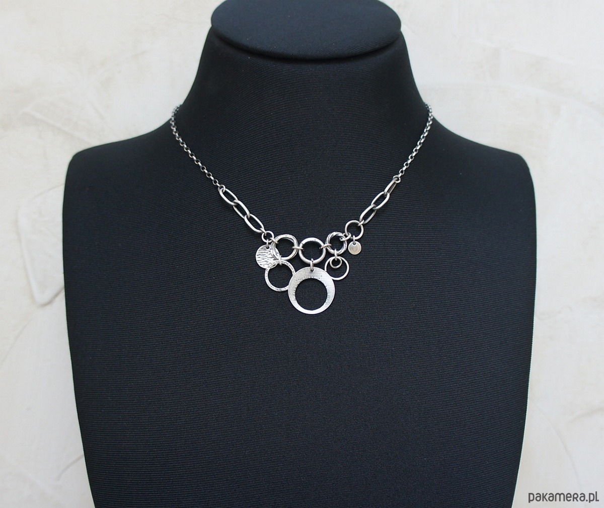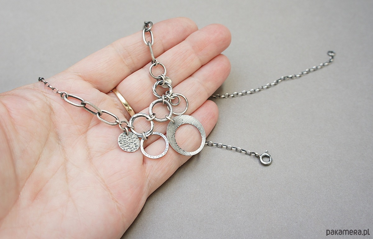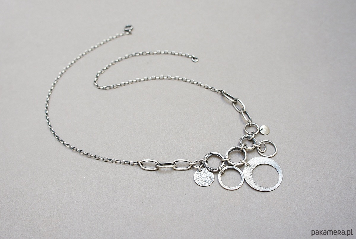 Naszyjnik wykonany w całości ze srebra [pr. 925] w połączeniu z zawieszkami o surowej strukturze. Srebro oksydowane i przetarte. Całkowita długość łańcuszka około 44,5cm. Biżuteria ozdobnie zapakowana.