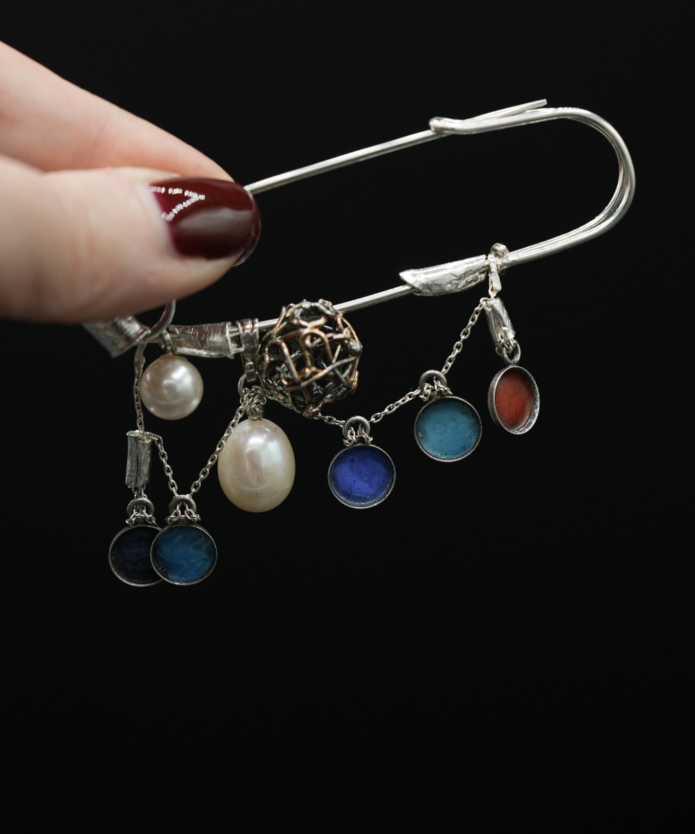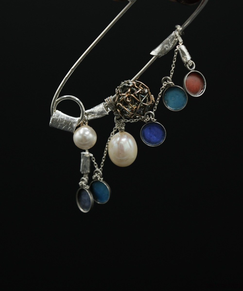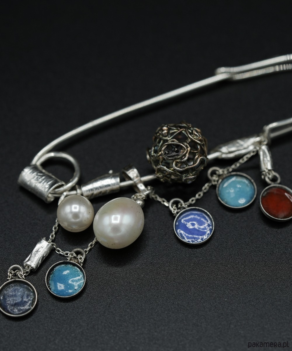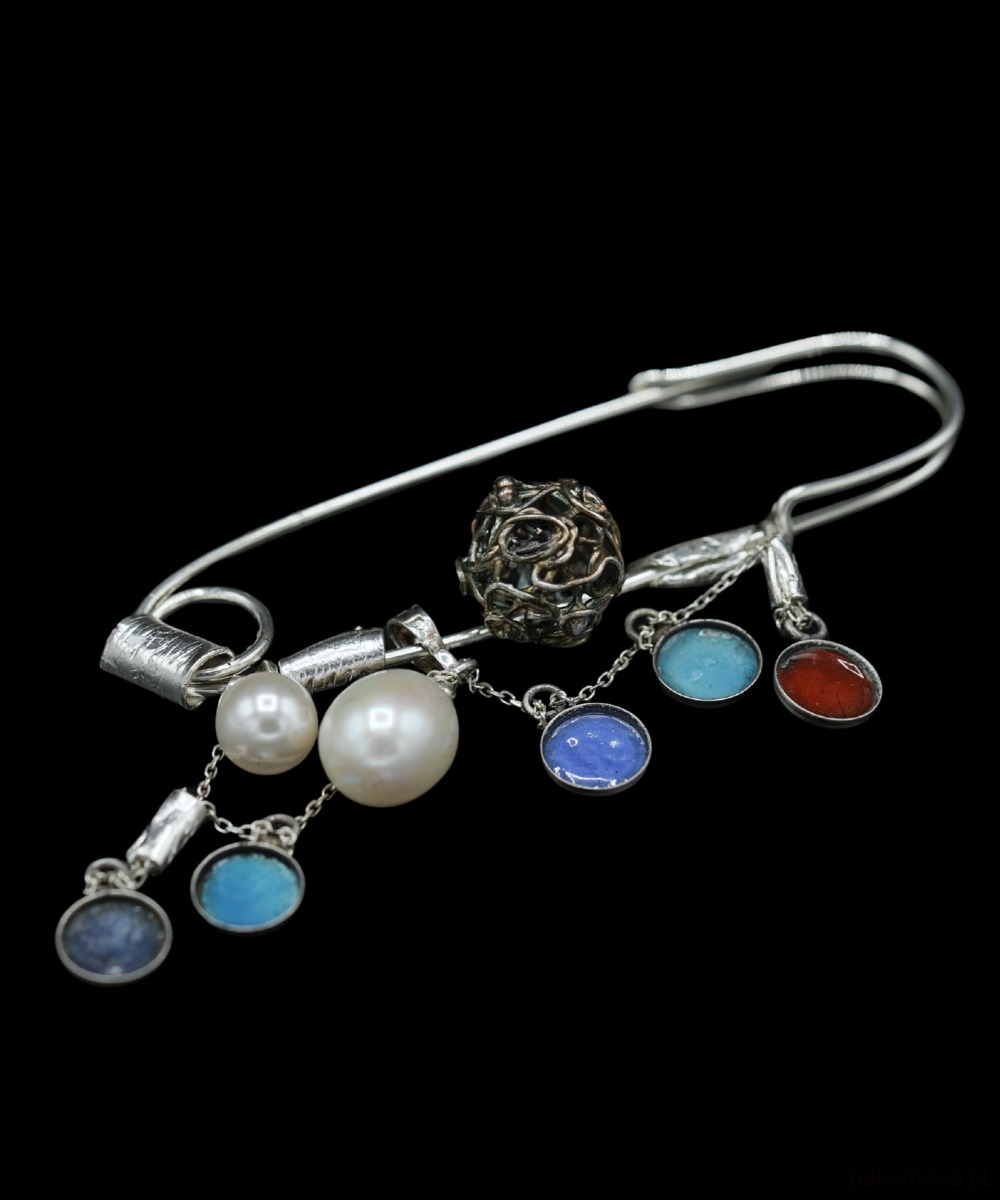 “Gypsy Caravan” is a brooch created on a silver safety pin, where every detail tells its own story. Hand-carved silver elements resemble small talismans of travelers, and irregular pearls add a noble, natural softness. Colorful enamel-filled palettes also hang from the safety pin – in shades of blue, navy blue, and warm red – like colorful lanterns flickering by a wandering caravan. The centrally placed openwork, carved ball gives the whole piece the character of an amulet that could accompany you on a long, mysterious journey.