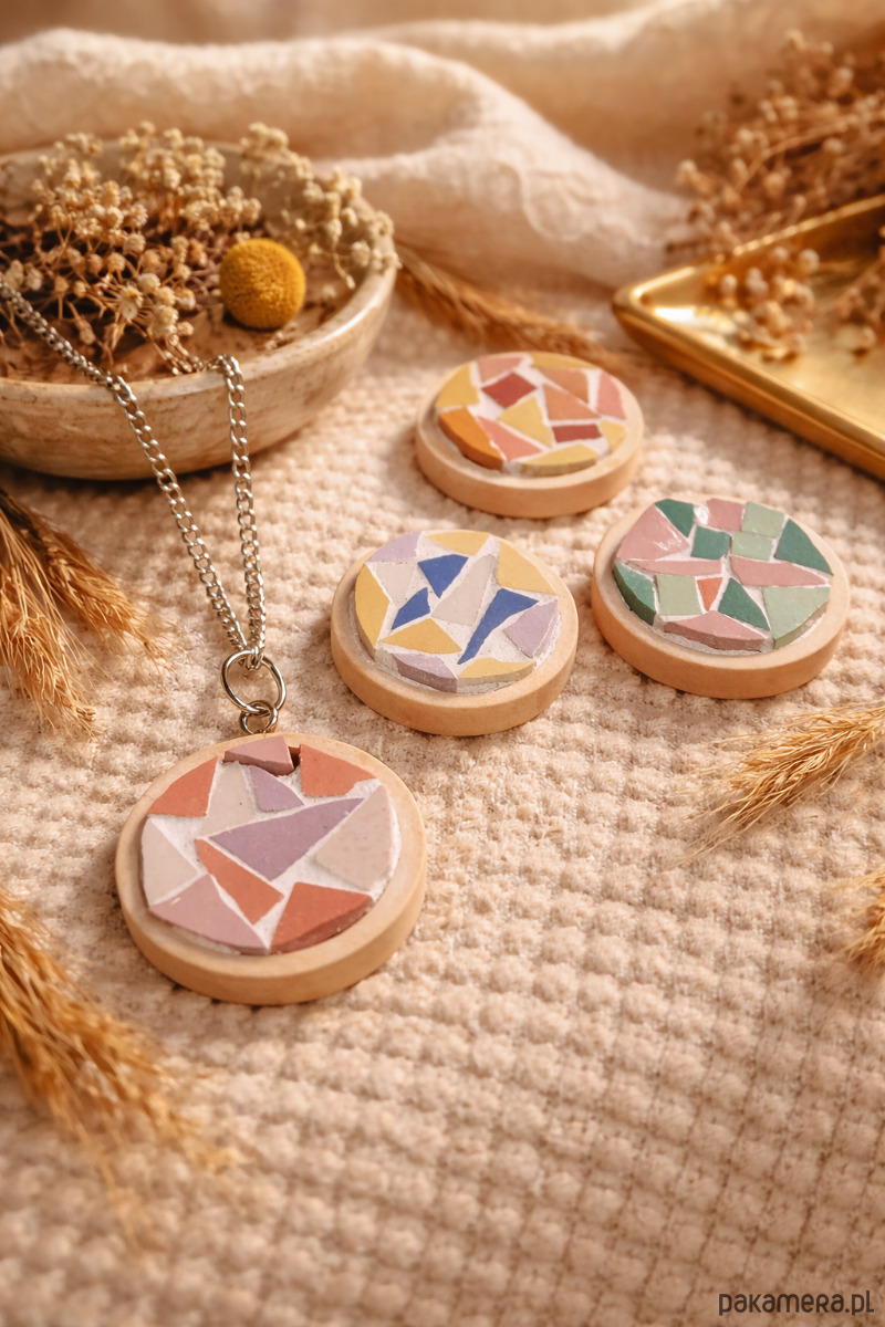 Drewniana zawieszka z gresową mozaiką w ciepłych kolorach, ręcznie wykonana. Srebrne lub złote wykończenie (do wyboru). Pięknie się prezentuje. Unikatowa biżuteria to idealny prezent dla ukochanej osoby, ale także oryginalna ozdoba dla samej siebie :)