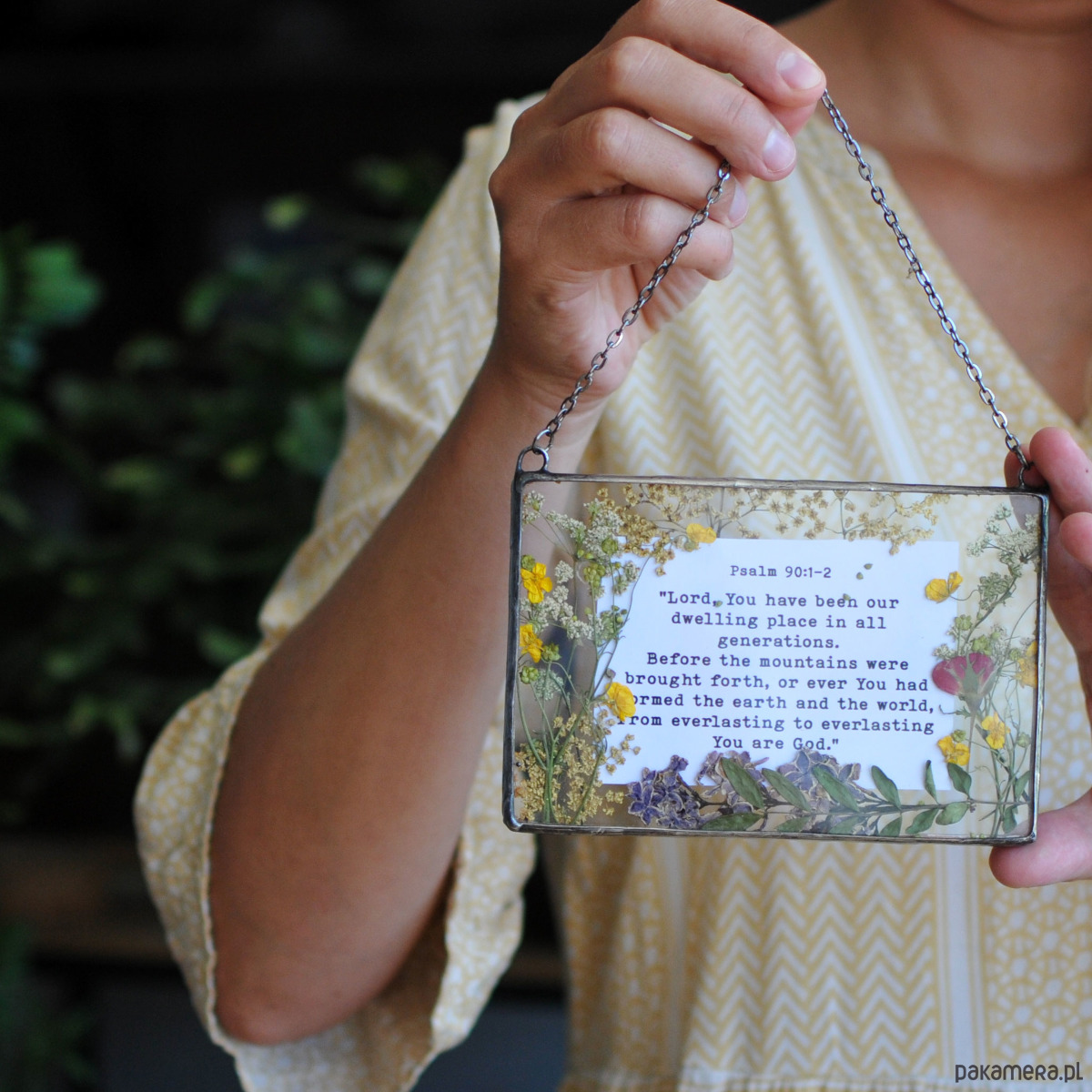 Dekoracyjny witraż z kompozycją z suszonych roślin wykonany w całości w pracowni rękodzieła MARIAELA. Prezent z klasą.