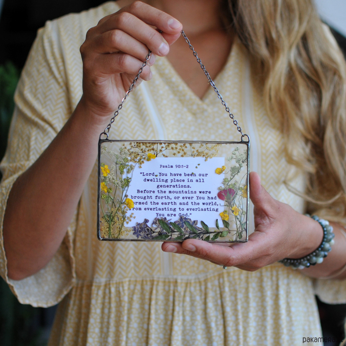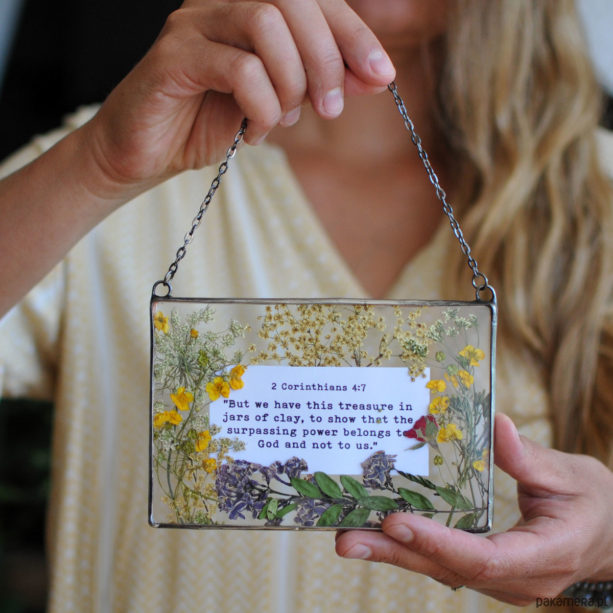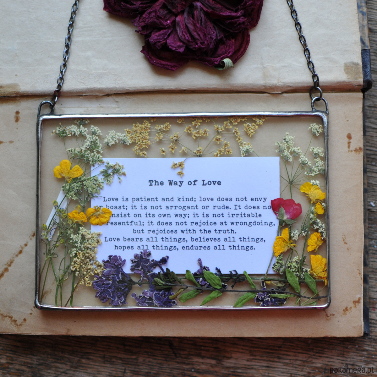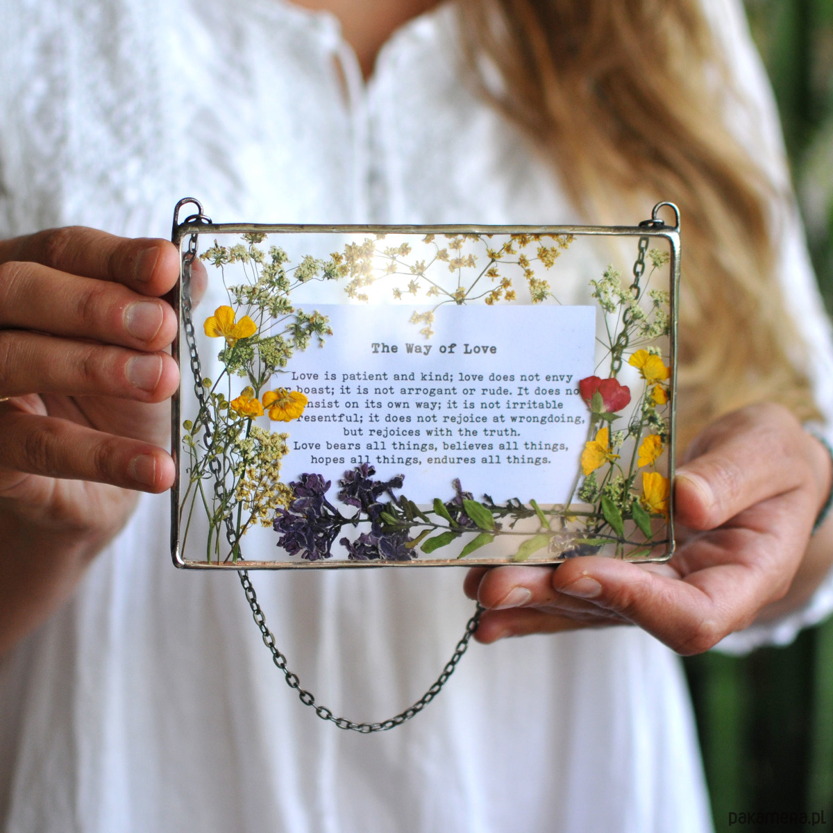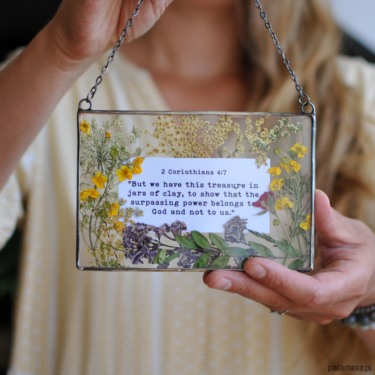 Dekoracyjny witraż z kompozycją z suszonych roślin wykonany w całości w pracowni rękodzieła MARIAELA. Prezent z klasą.