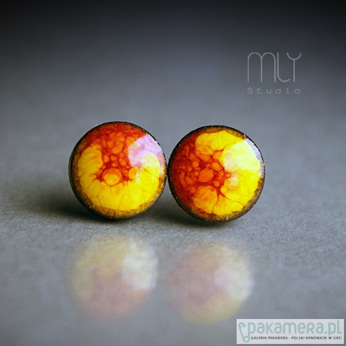 Ceramiczne okrągłe kolczyki w formie sztyftów, ręcznie wykonane z delikatnej gliny kamionkowej jednostronnie szkliwione intensywnym pomarańczowym szkliwem z efektem plamek i pięknym połyskiem, na antyalergicznych sztyftach w kolorze srebrnym. Średnica ok. 11mm. Polecam