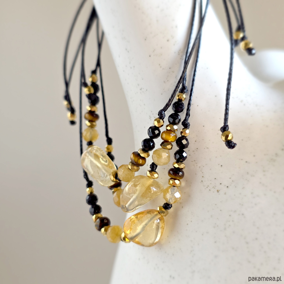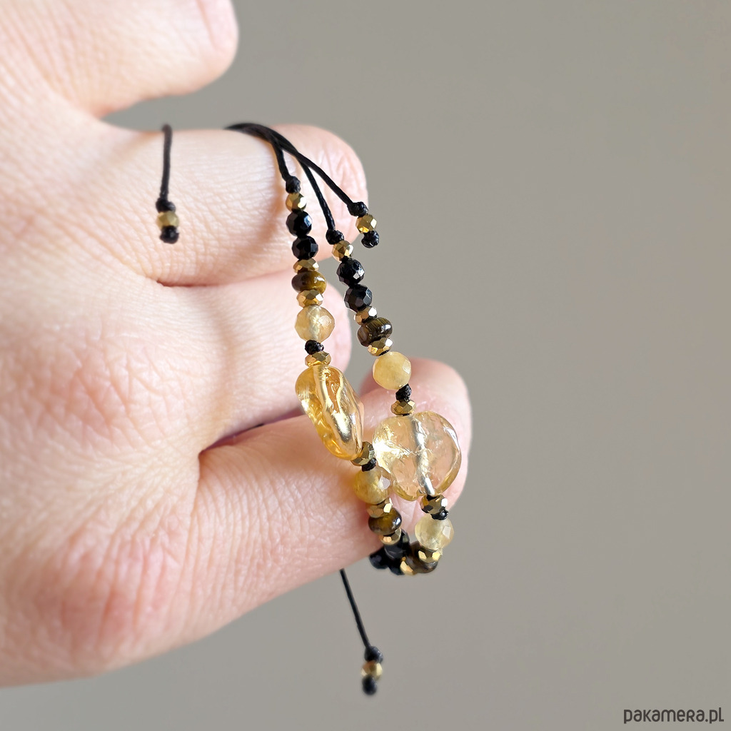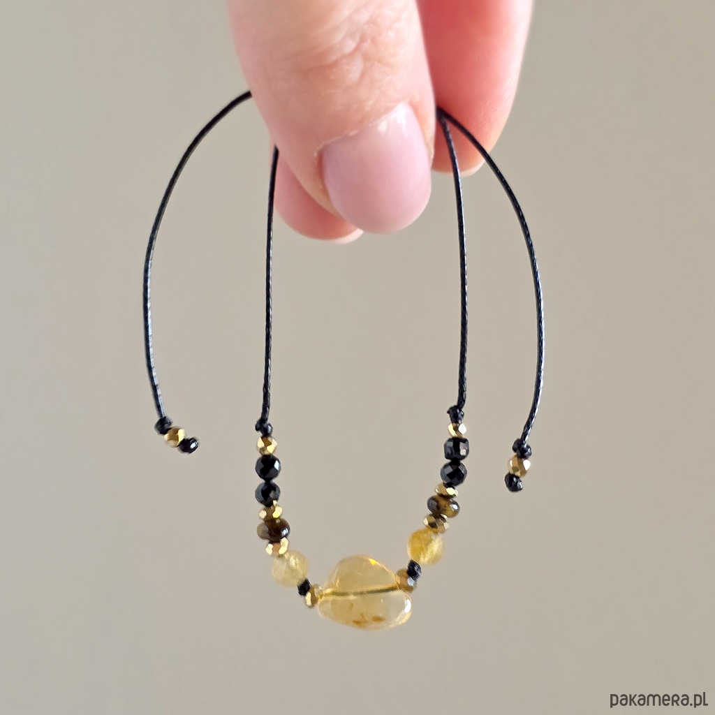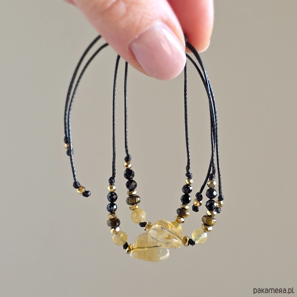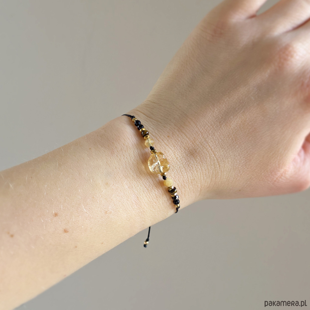 Bransoletka wykonana z kamieni naturalnych - cytrynu (prażony), apatytu żółtego, tygrysiego oka, czarnego turmalinu i hematytu oraz nylonowego sznureczka. Bransoletka będzie odpowiednia na nadgarstek o obwodzie 15-17,5 cm.