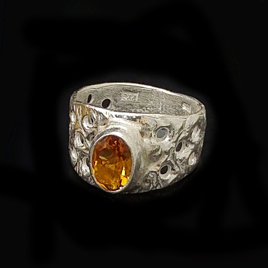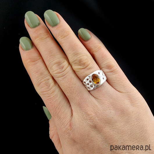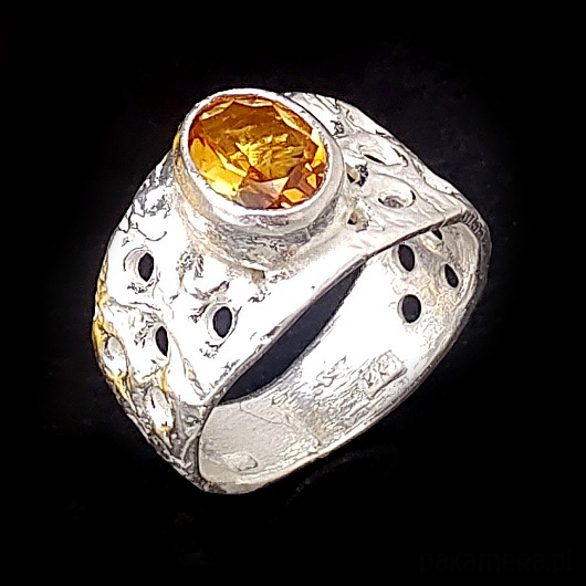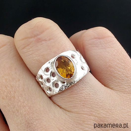 Przepiękny, szlifowany cytryn oprawiony w surową ramę. Wymiary oprawy kamienia 9 x 7 mm. Pierścień waży 5,4 g. Naturalny cytryn ciekawie zakomponowany w srebro ręcznie formowane i oksydowane. Rozmiar jubilerski 15. Możliwe powiększenie na rozmiar max. 17. Pierścień zostanie zapakowany w ozdobne pudełeczko.