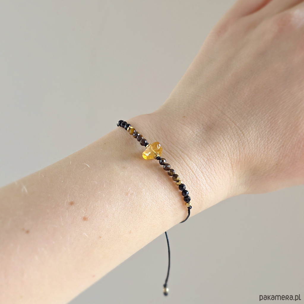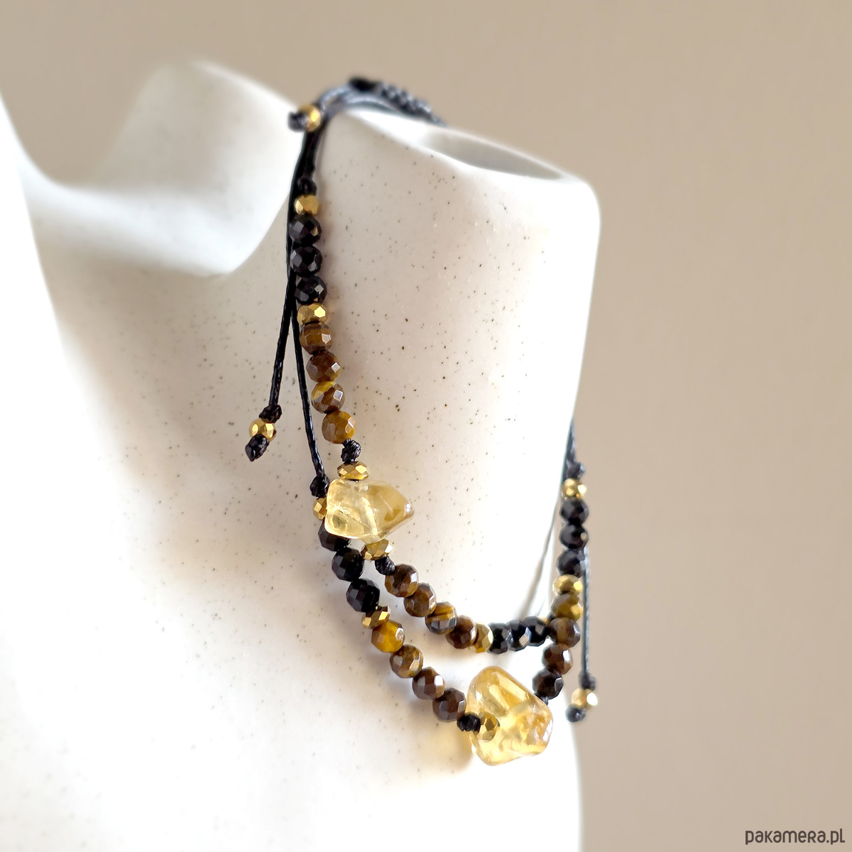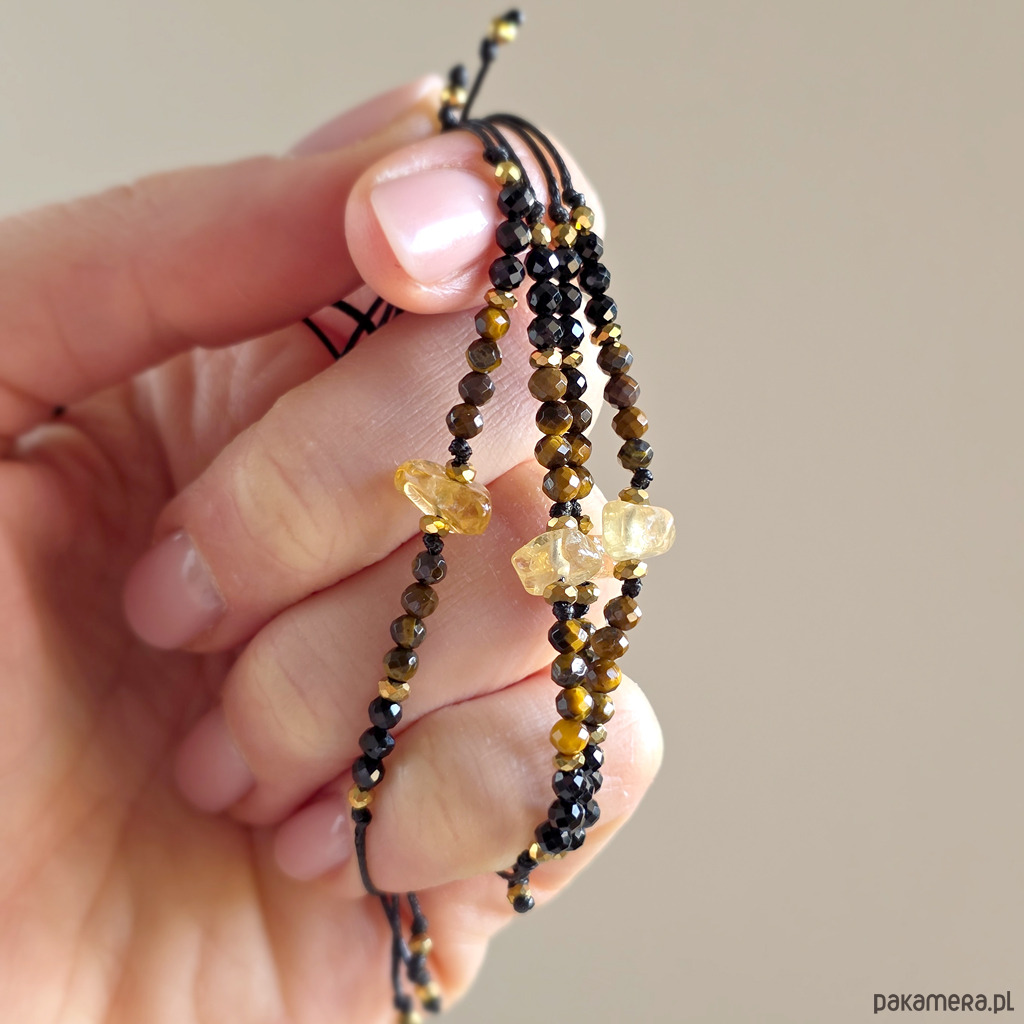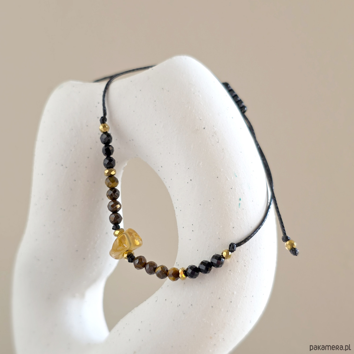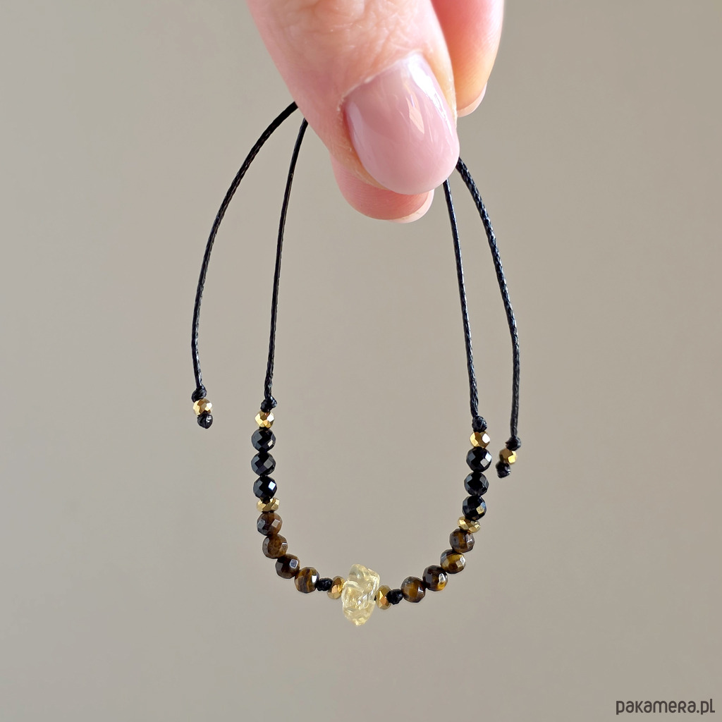 Bransoletka wykonana z kamieni naturalnych - cytrynu (prażony), tygrysiego oka, czarnego turmalinu i hematytu oraz nylonowego sznureczka. Bransoletka będzie odpowiednia na nadgarstek o obwodzie 15-17,5 cm.