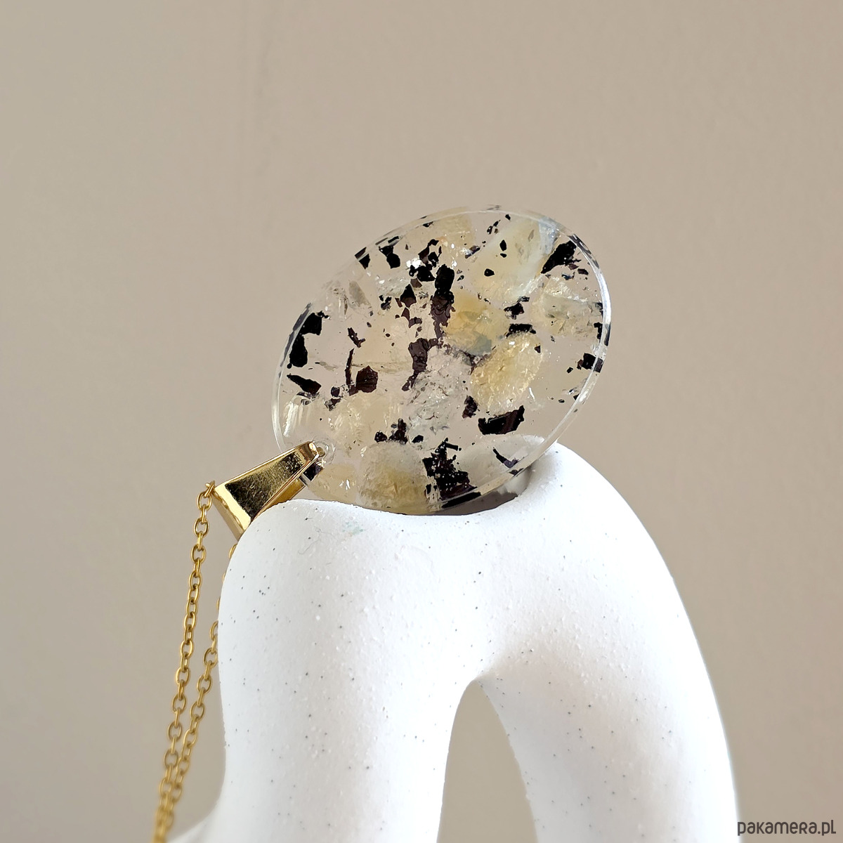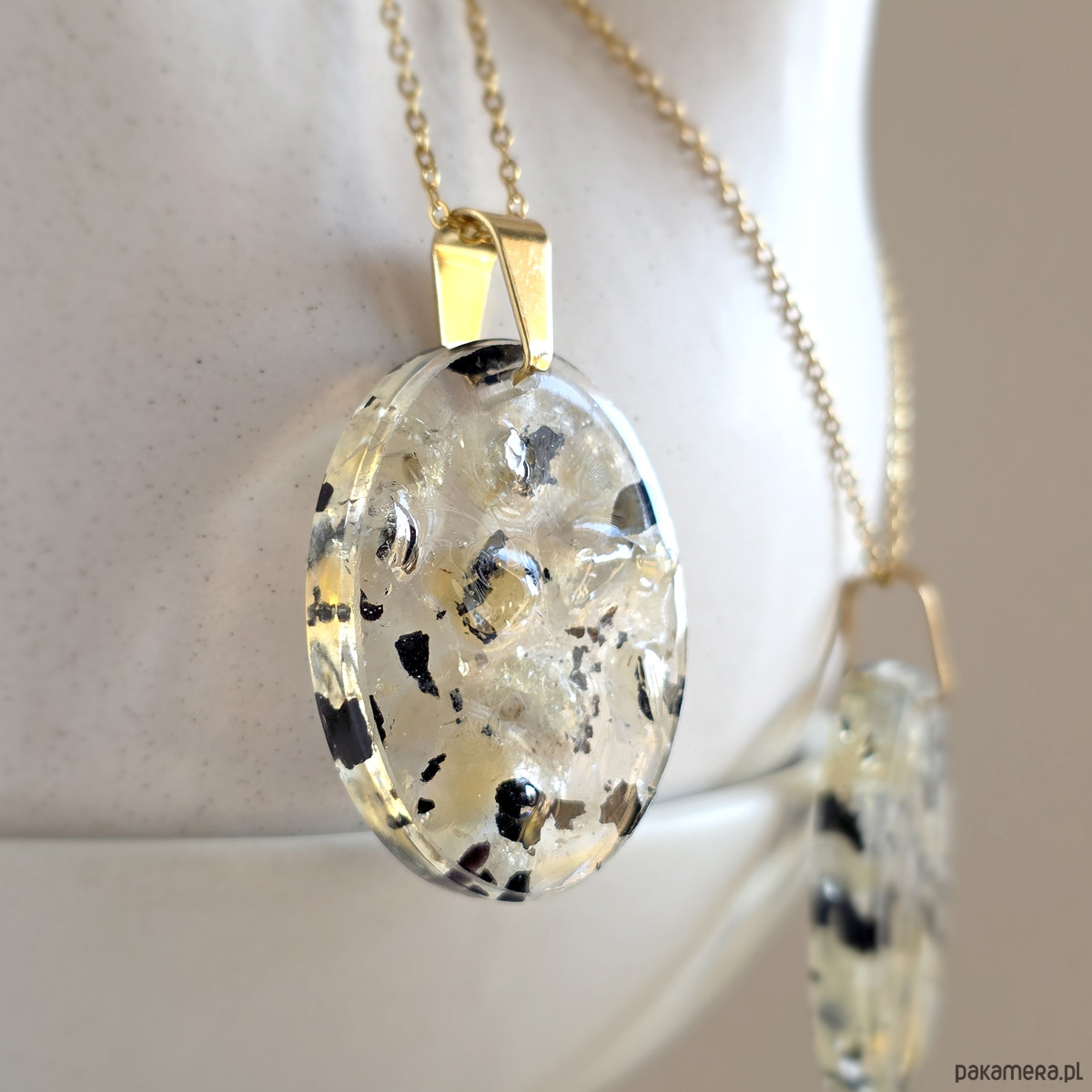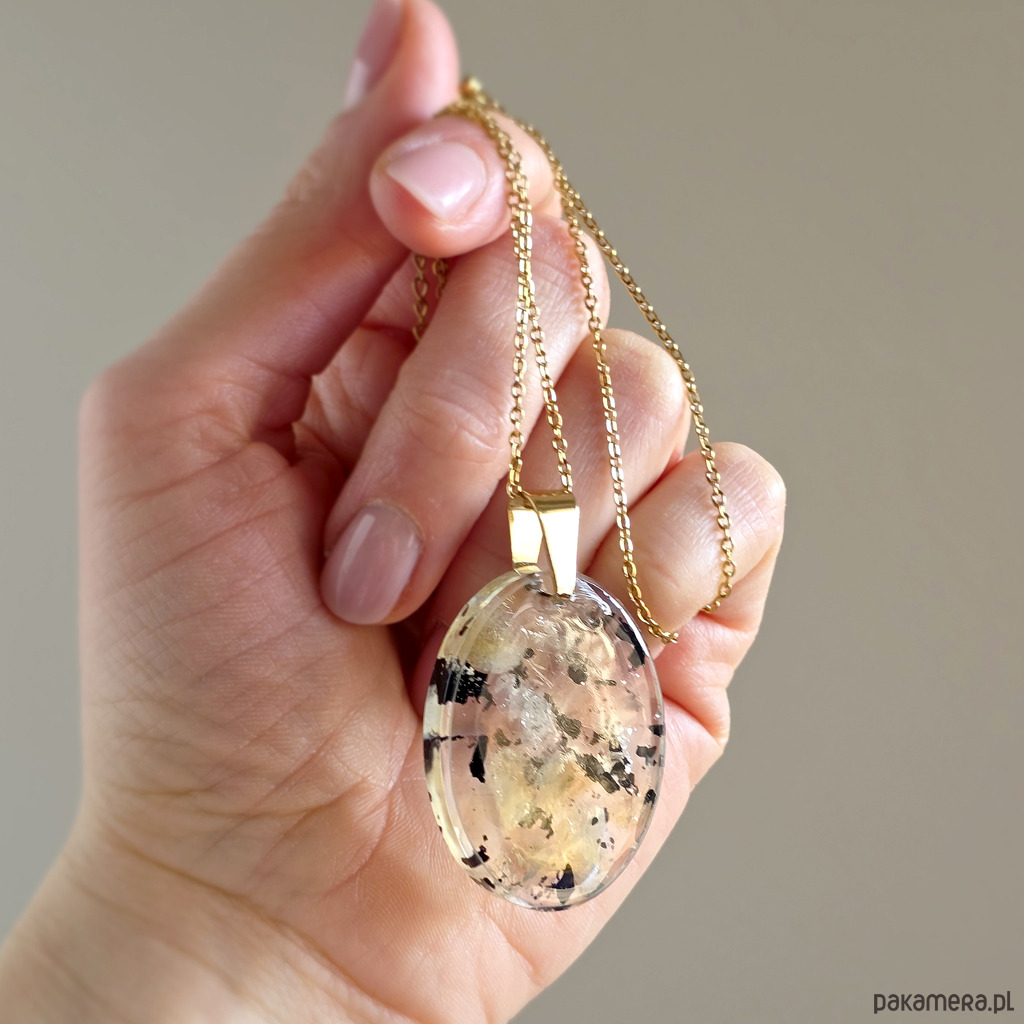 Naszyjnik wykonany z cytrynu (prażony i naturalny) i czarnego turmalinu zatopionych w żywicy jubilerskiej oraz elementów metalowych ze stali chirurgicznej.