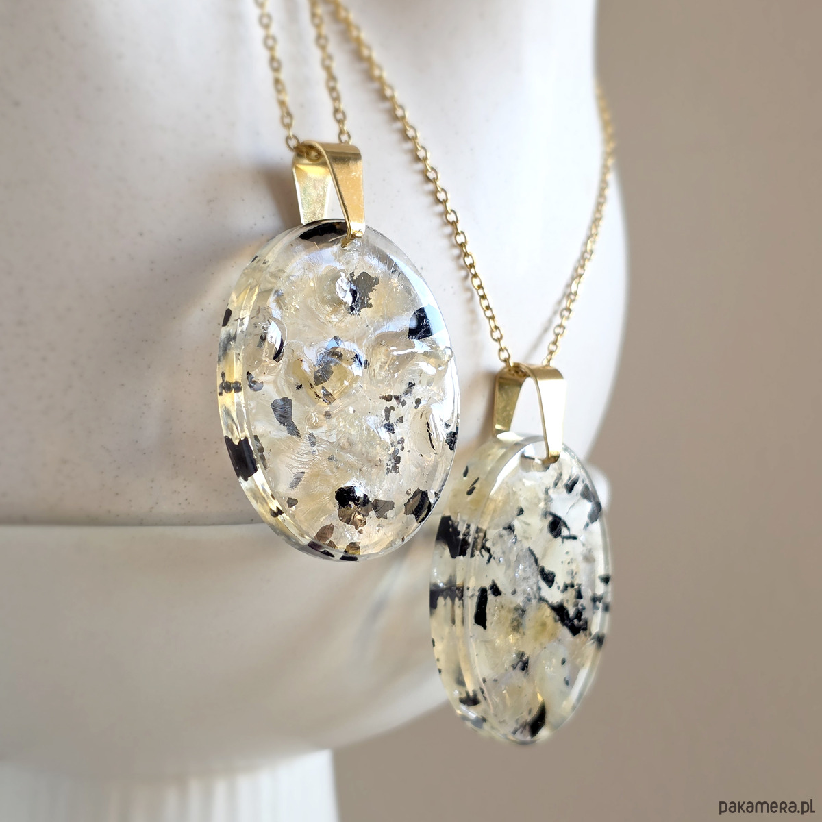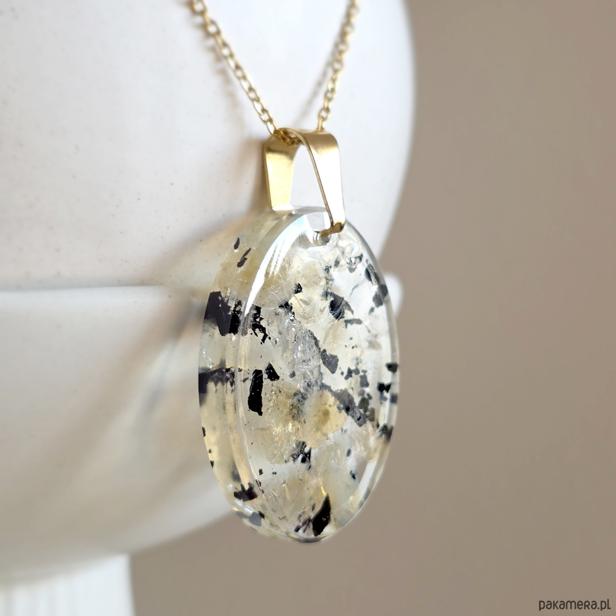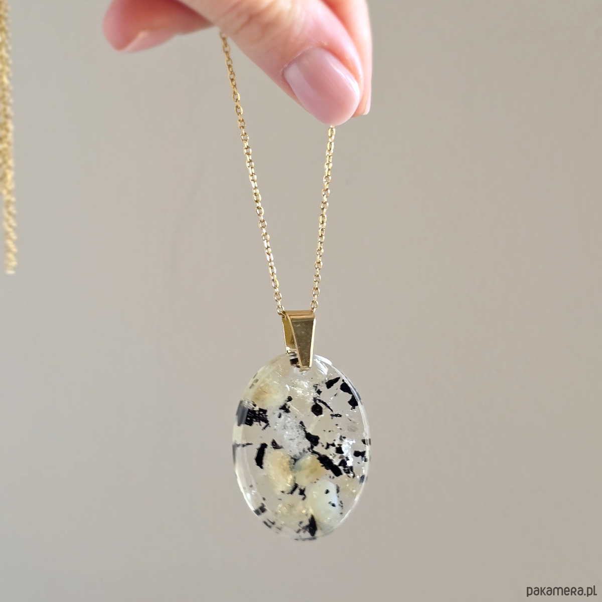 Naszyjnik wykonany z cytrynu (prażony i naturalny) i czarnego turmalinu zatopionych w żywicy jubilerskiej oraz elementów metalowych ze stali chirurgicznej.