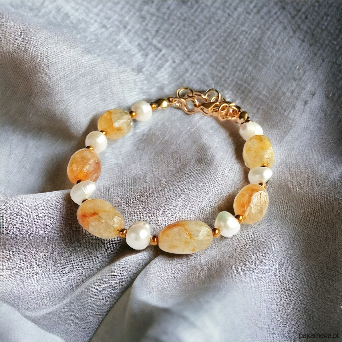 wykonana z nieregularnych, polerowanych bryłek cytrynu oraz naturalnych pereł słodkowodnych i złotego hematytu.