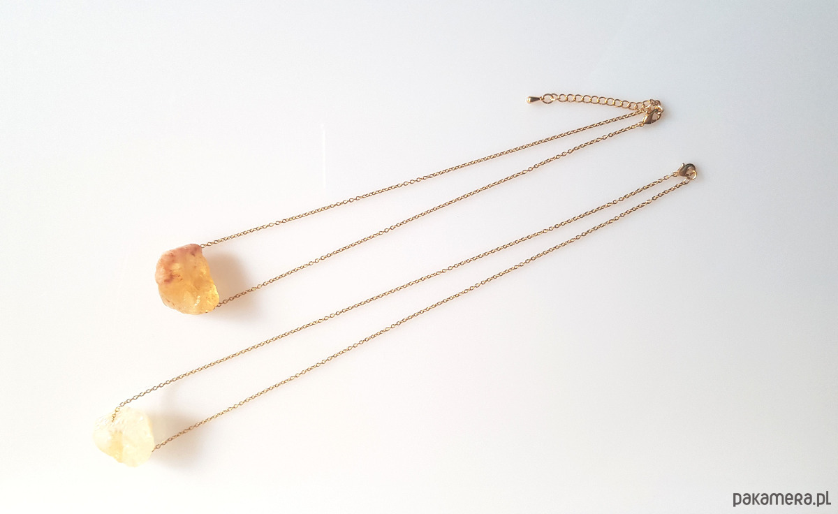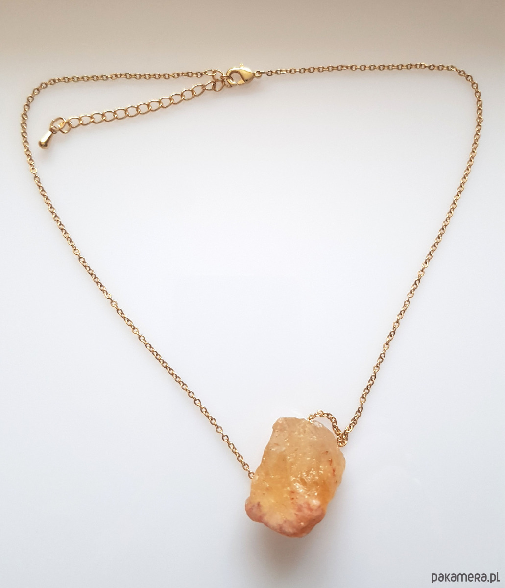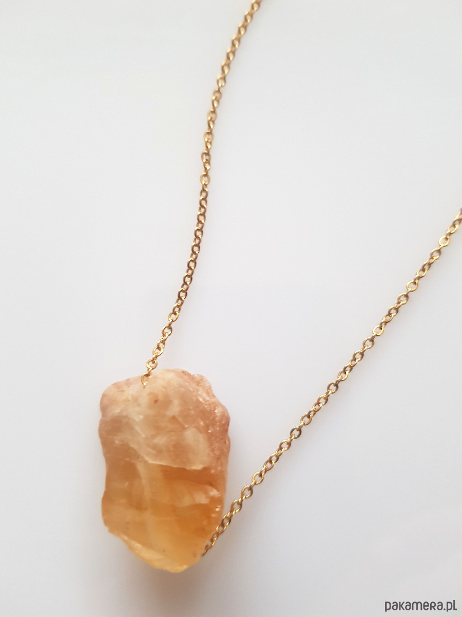 Bryła naturalnego, surowego cytrynu osadzona ruchomo na pozłacanym łańcuszku ze stali szlachetnej.