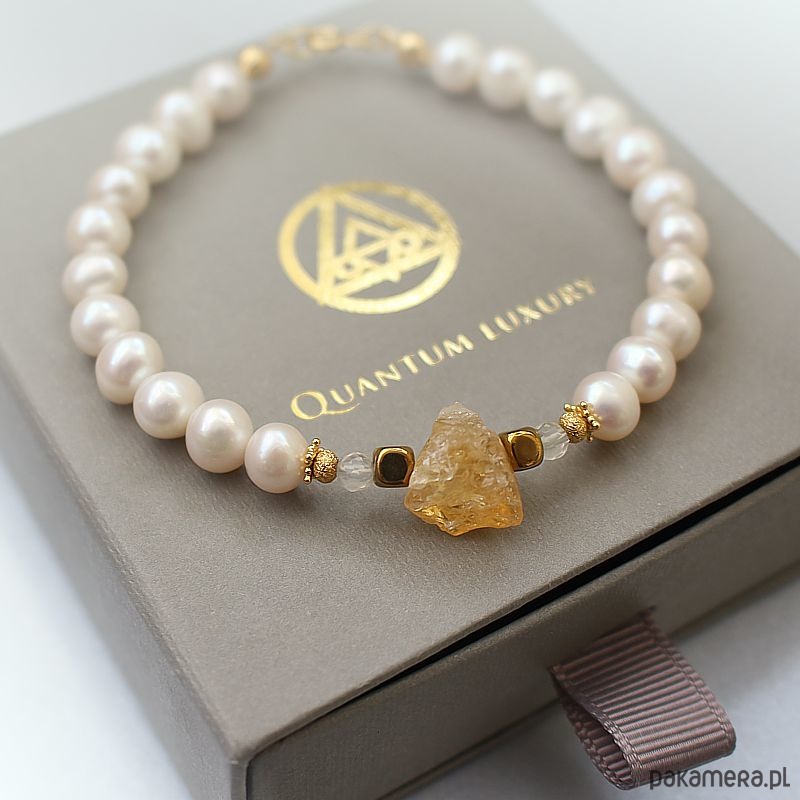 Elegancka energetyczna bransoletka - Głębia mądrości. Srebro 925 pozłacane 24k złotem, naturalne perły słodkowodne potato z surowym cytrynem wspierająca uzdrawianie czakry korony i splotu słonecznego, wzorca relacji z Uniwersalną Prawdą i przewodnictwem Źródła Życia.